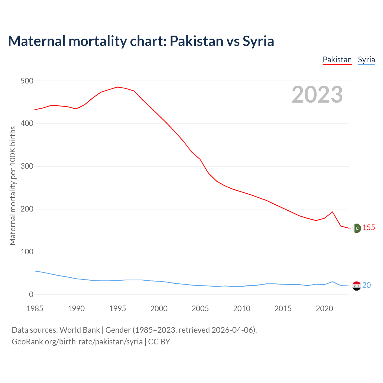 The maternal mortality rate, which is the probability of dying during childbirth or within 42 days of pregnancy termination, is 155 deaths per 100,000 live births in Pakistan, compared to 20 deaths in Syria.