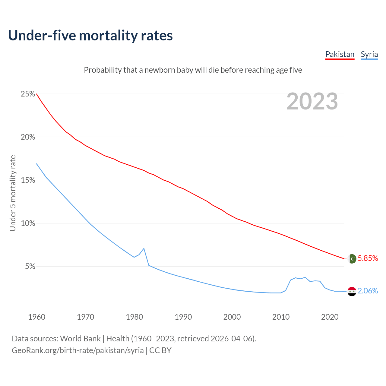 The chance that a newborn baby will die before reaching age five is 5.85% in Pakistan and 2.06% in Syria. Above is a chart with historical data on under-five mortality rates.