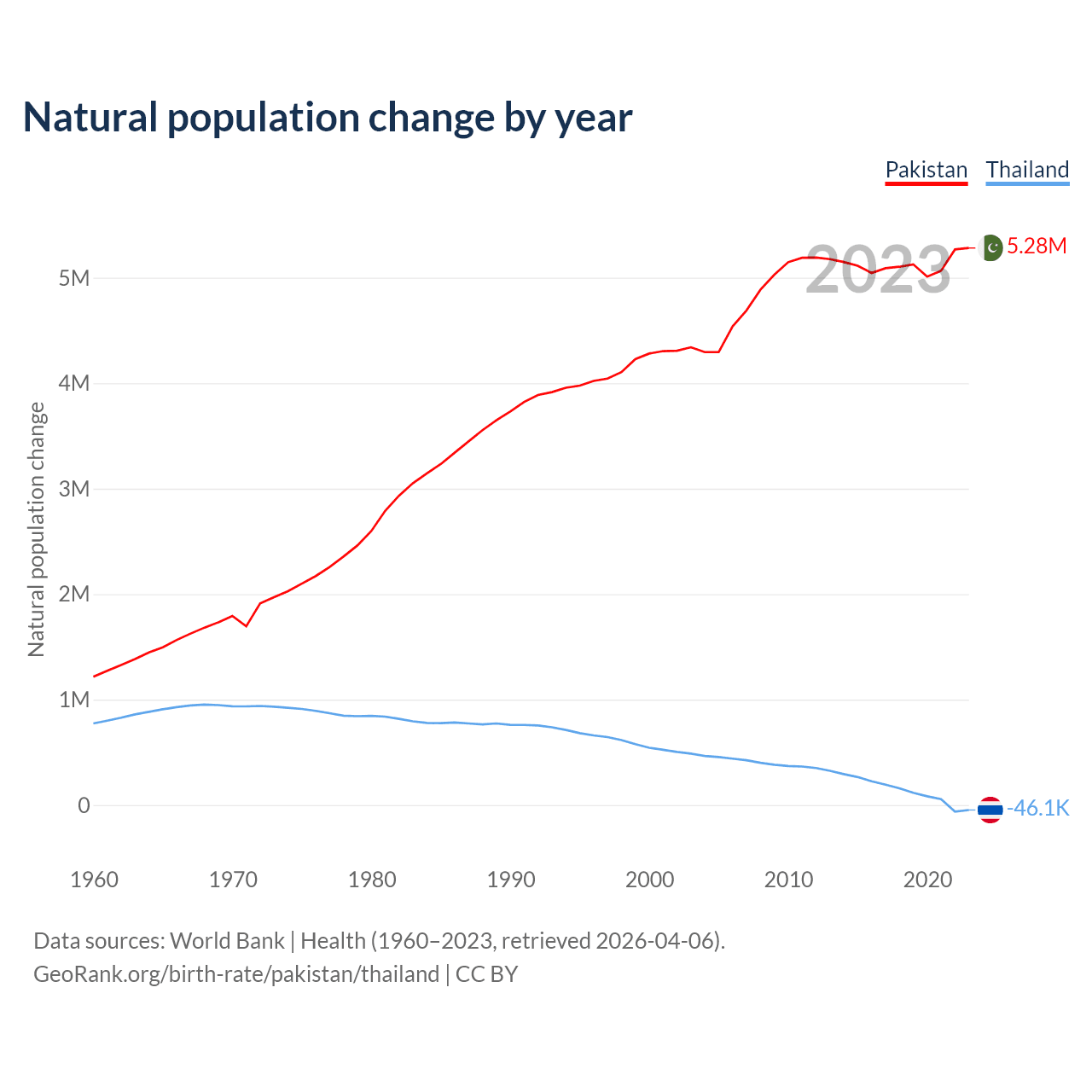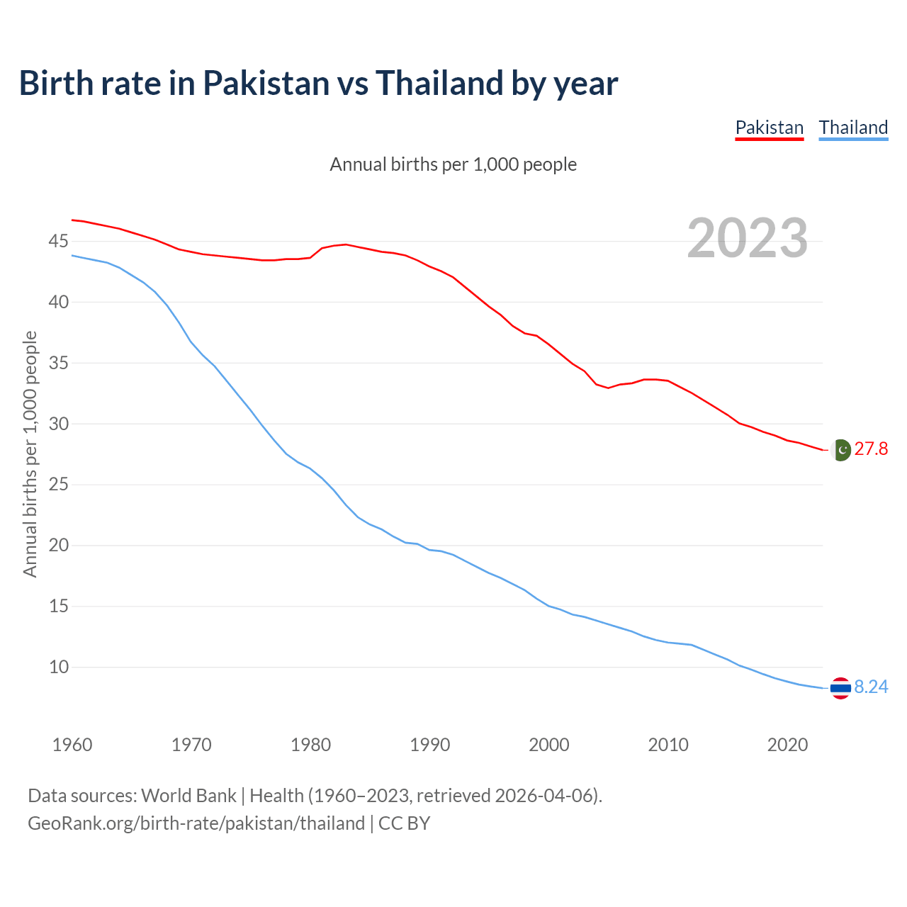 According to the latest available data on birth rates, the fertility rate in Pakistan was 3.61 children per woman in 2023, compared to 1.21 in Thailand in 2023. The replacement level is considered to be 2.1 children per woman.