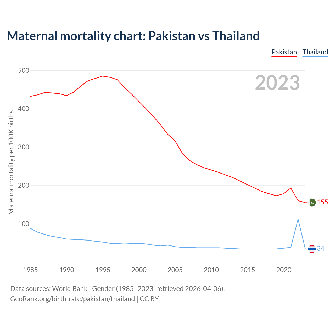 The maternal mortality rate, which is the probability of dying during childbirth or within 42 days of pregnancy termination, is 155 deaths per 100,000 live births in Pakistan, compared to 34 deaths in Thailand.