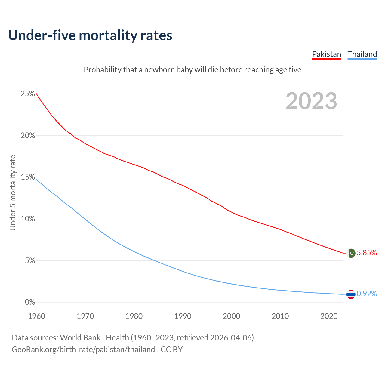 The chance that a newborn baby will die before reaching age five is 5.85% in Pakistan and 0.92% in Thailand. Above is a chart with historical data on under-five mortality rates.