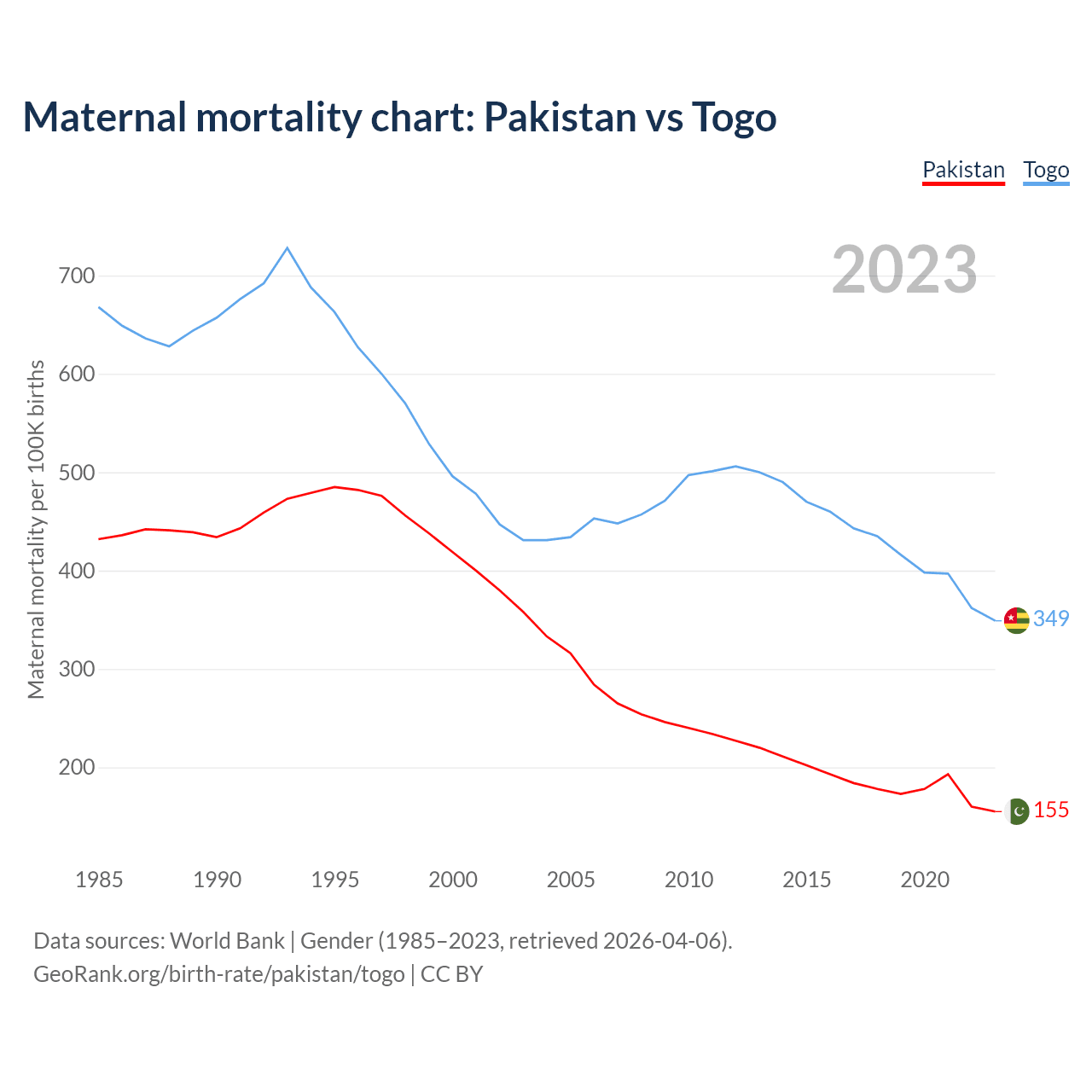 The maternal mortality rate, which is the probability of dying during childbirth or within 42 days of pregnancy termination, is 155 deaths per 100,000 live births in Pakistan, compared to 349 deaths in Togo.