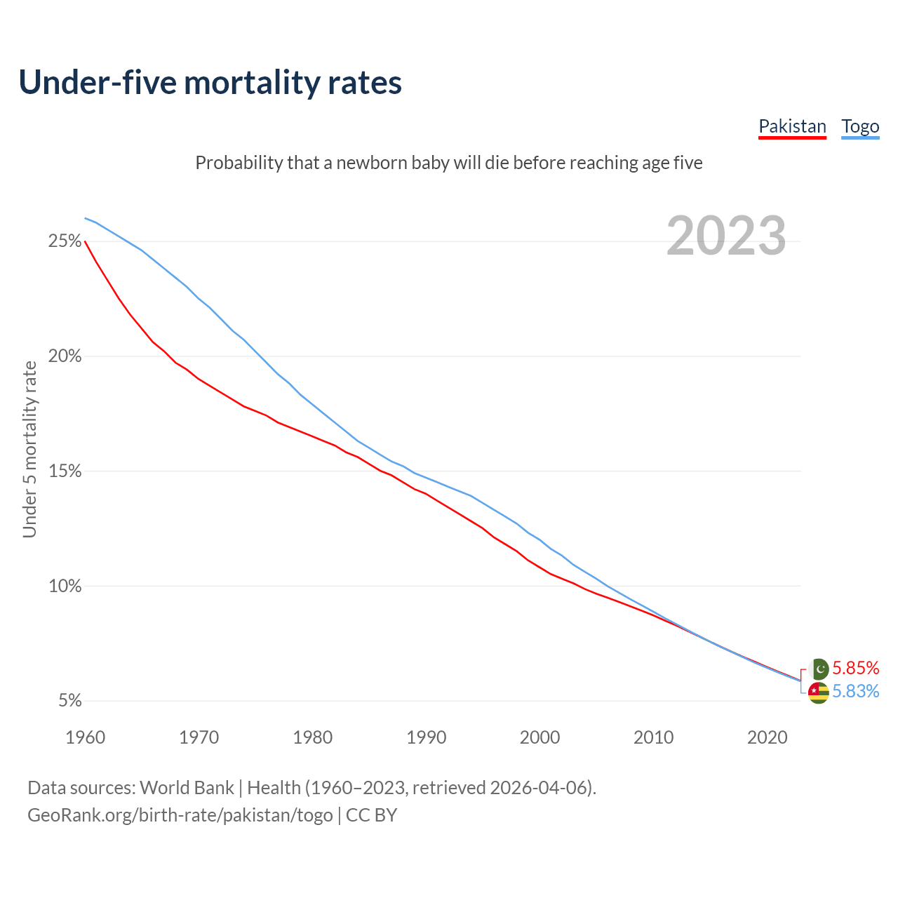 The chance that a newborn baby will die before reaching age five is 5.85% in Pakistan and 5.83% in Togo. Above is a chart with historical data on under-five mortality rates.