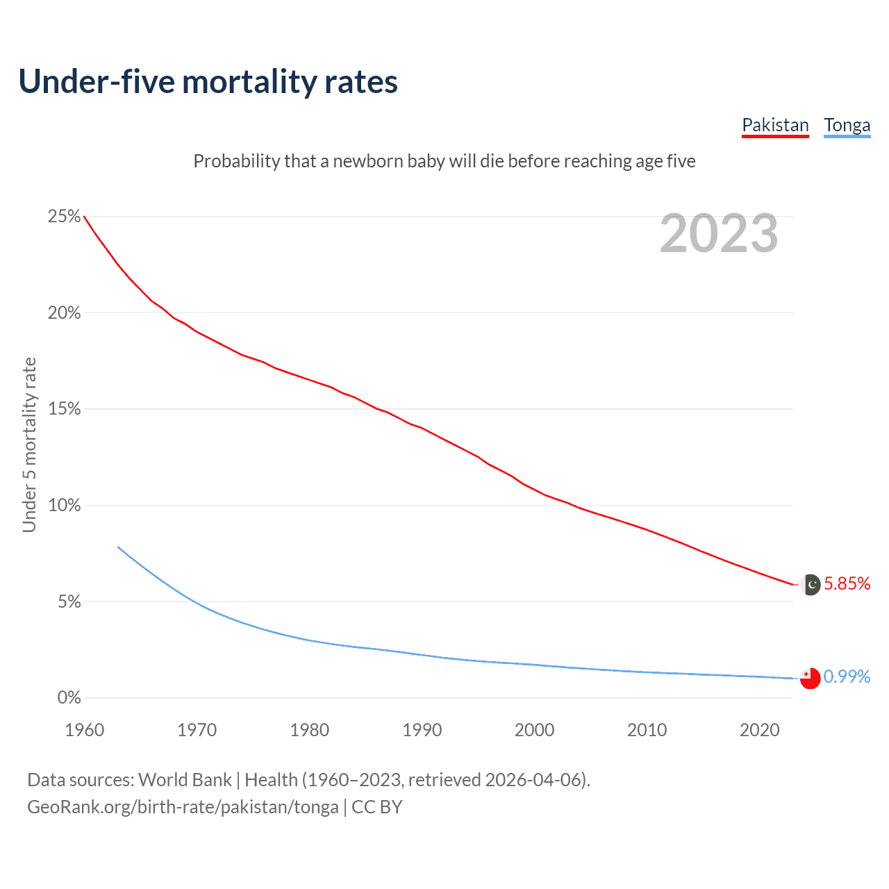 The chance that a newborn baby will die before reaching age five is 5.85% in Pakistan and 0.99% in Tonga. Above is a chart with historical data on under-five mortality rates.