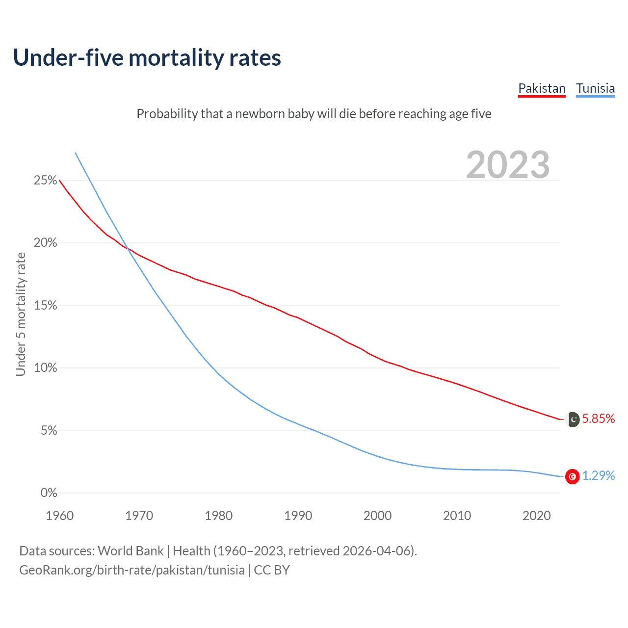 The chance that a newborn baby will die before reaching age five is 5.85% in Pakistan and 1.29% in Tunisia. Above is a chart with historical data on under-five mortality rates.