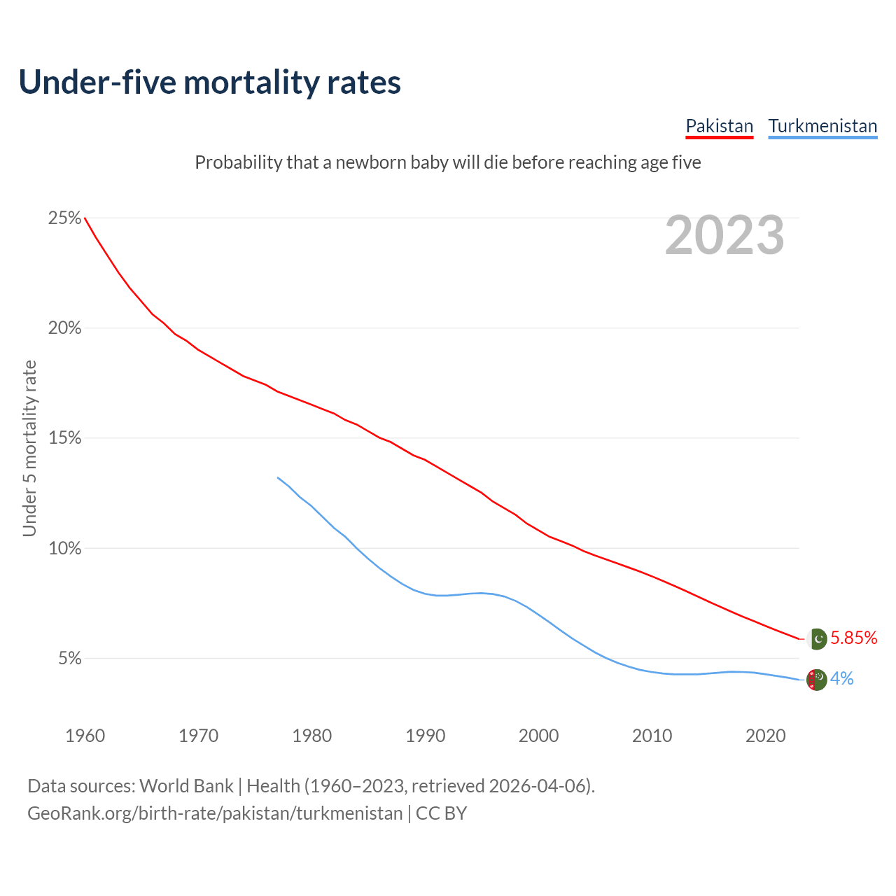 The chance that a newborn baby will die before reaching age five is 5.85% in Pakistan and 4% in Turkmenistan. Above is a chart with historical data on under-five mortality rates.