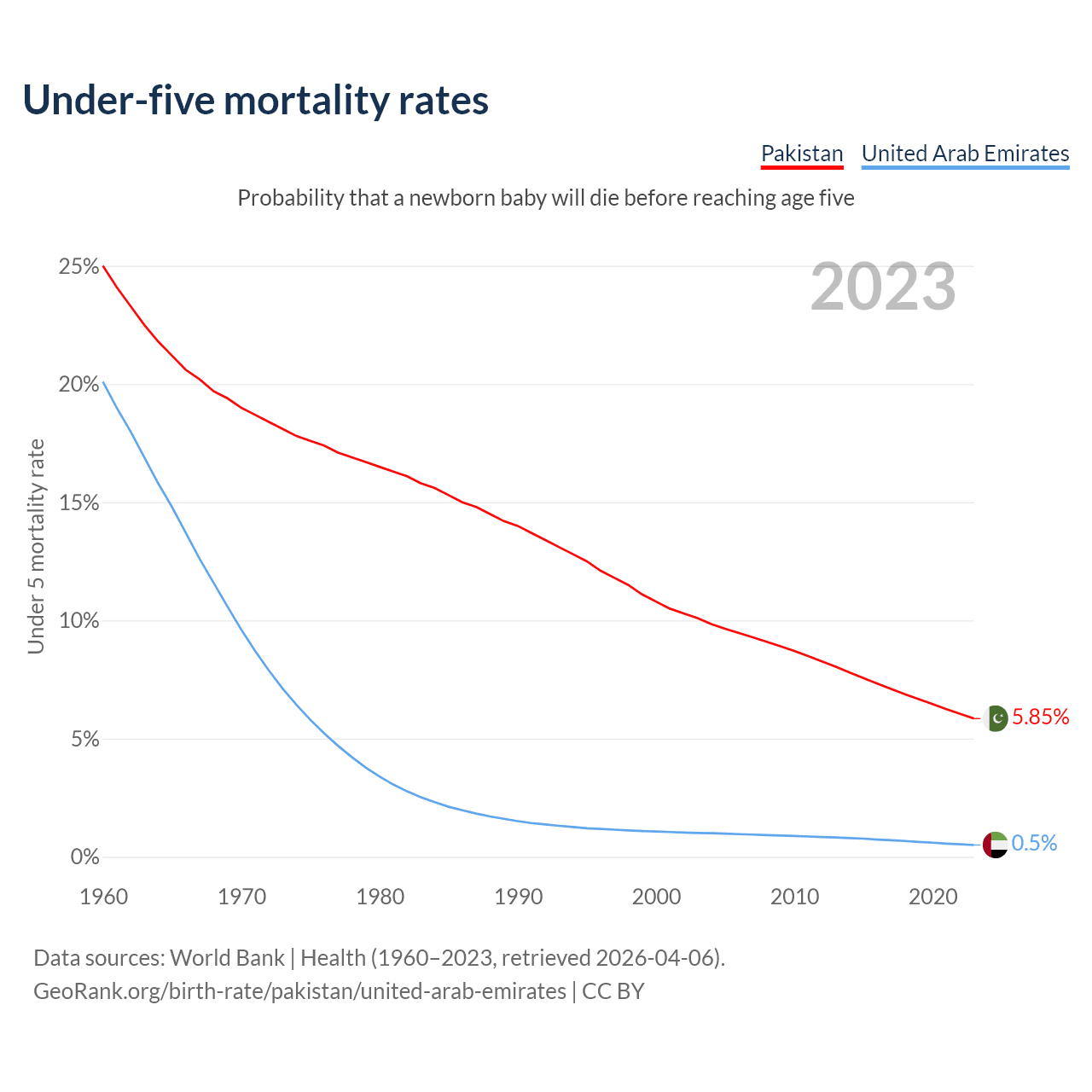 The chance that a newborn baby will die before reaching age five is 5.85% in Pakistan and 0.5% in the United Arab Emirates. Above is a chart with historical data on under-five mortality rates.