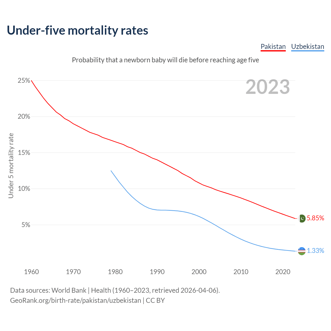 The chance that a newborn baby will die before reaching age five is 5.85% in Pakistan and 1.33% in Uzbekistan. Above is a chart with historical data on under-five mortality rates.