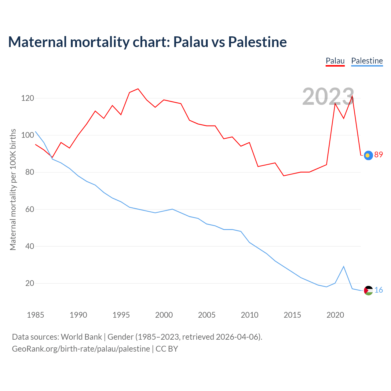 The maternal mortality rate, which is the probability of dying during childbirth or within 42 days of pregnancy termination, is 89 deaths per 100,000 live births in Palau, compared to 16 deaths in Palestine.