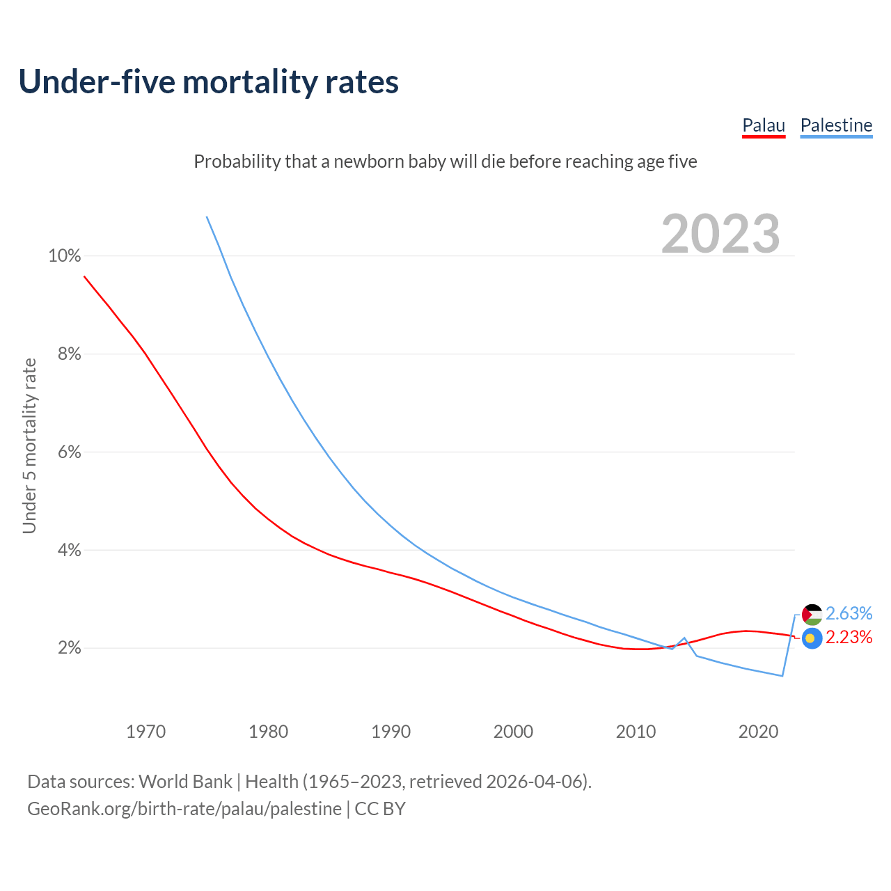 The chance that a newborn baby will die before reaching age five is 2.23% in Palau and 2.63% in Palestine. Above is a chart with historical data on under-five mortality rates.