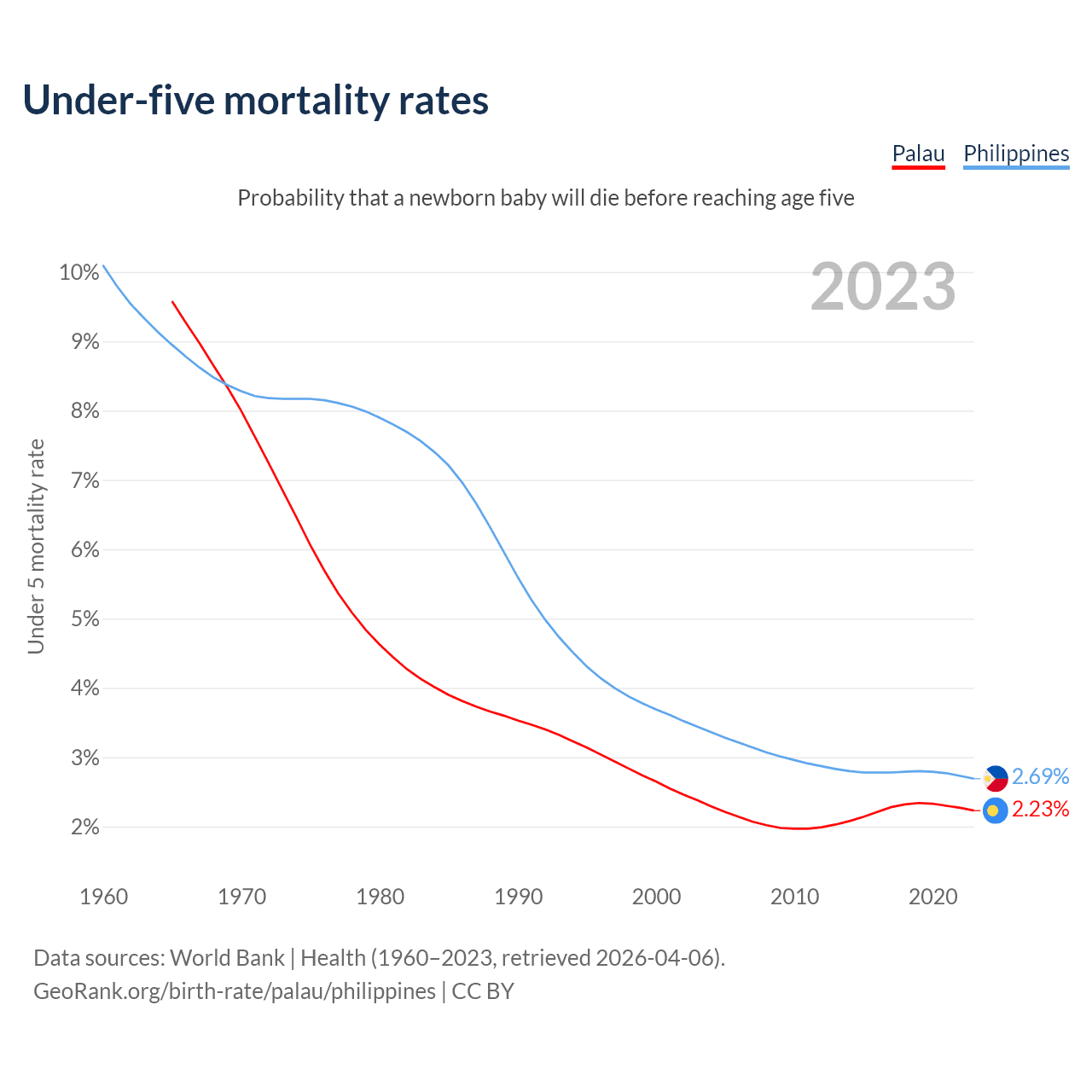 The chance that a newborn baby will die before reaching age five is 2.23% in Palau and 2.69% in the Philippines. Above is a chart with historical data on under-five mortality rates.