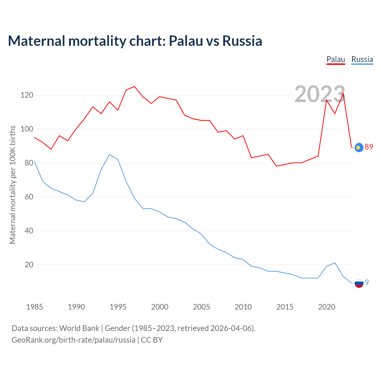 The maternal mortality rate, which is the probability of dying during childbirth or within 42 days of pregnancy termination, is 89 deaths per 100,000 live births in Palau, compared to 9 deaths in Russia.