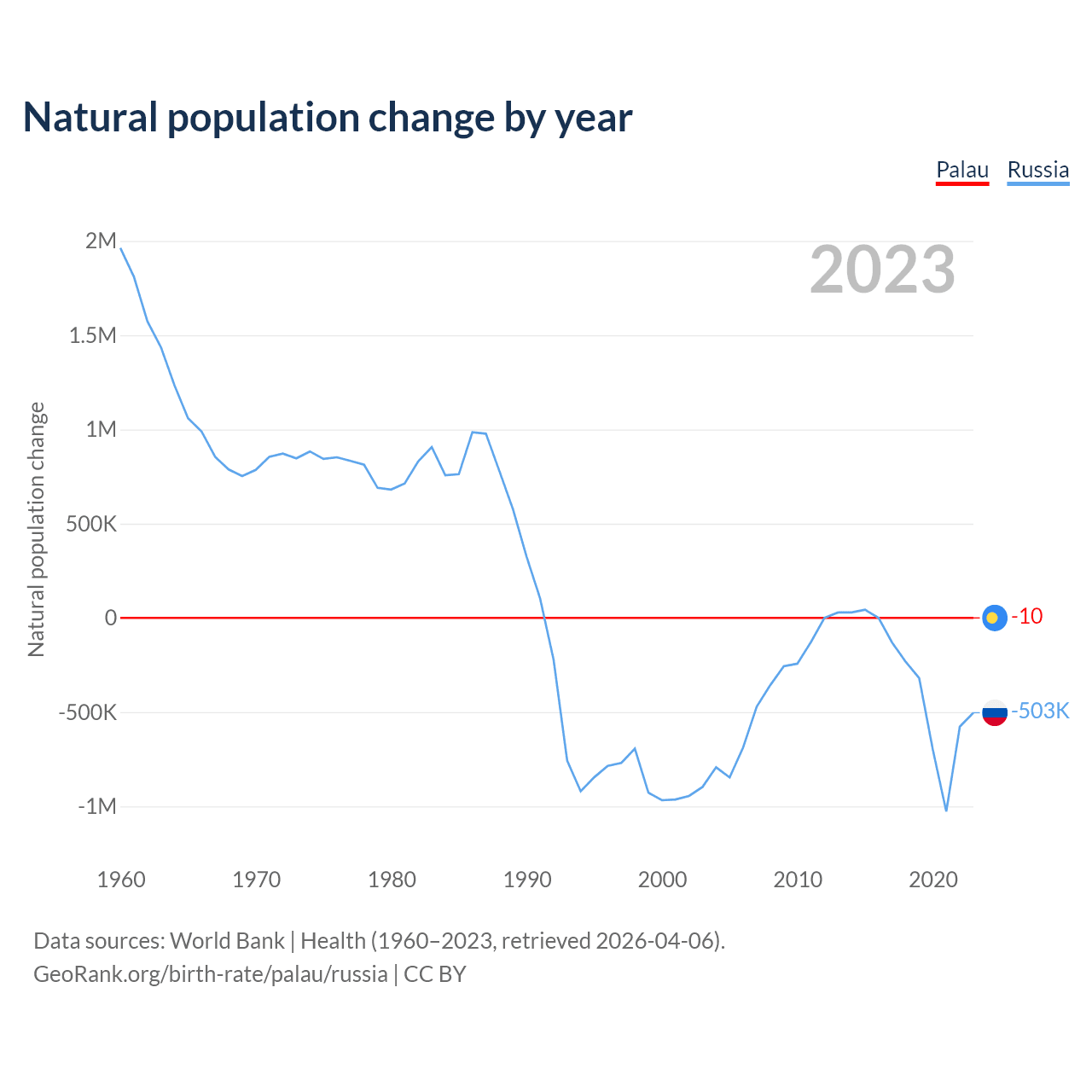 According to the latest available data on birth rates, the fertility rate in Palau was 1.91 children per woman in 2023, compared to 1.41 in Russia in 2023. The replacement level is considered to be 2.1 children per woman.