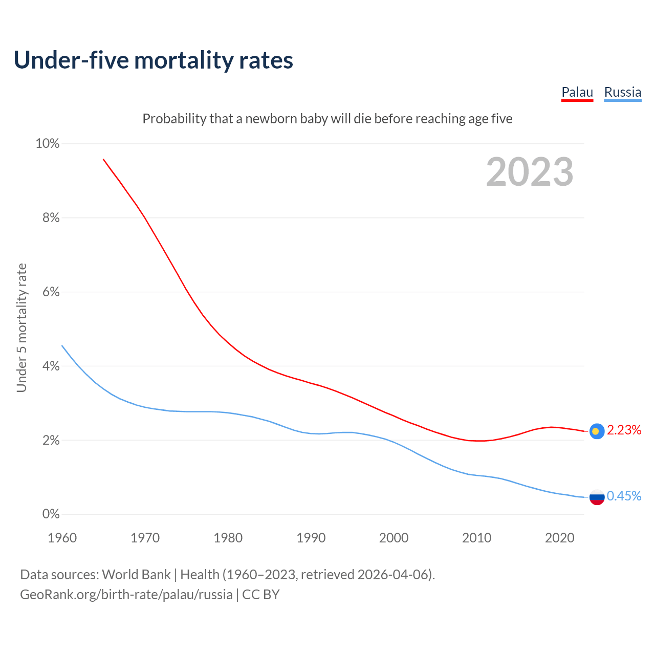 The chance that a newborn baby will die before reaching age five is 2.23% in Palau and 0.45% in Russia. Above is a chart with historical data on under-five mortality rates.