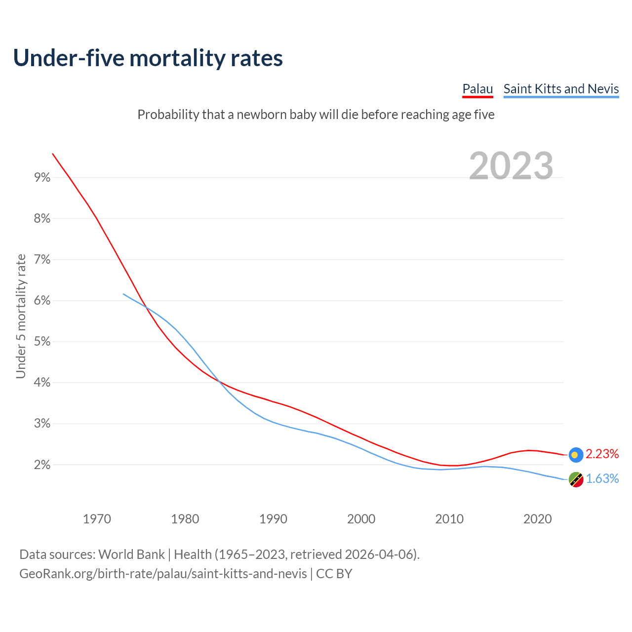 The chance that a newborn baby will die before reaching age five is 2.23% in Palau and 1.63% in Saint Kitts and Nevis. Above is a chart with historical data on under-five mortality rates.