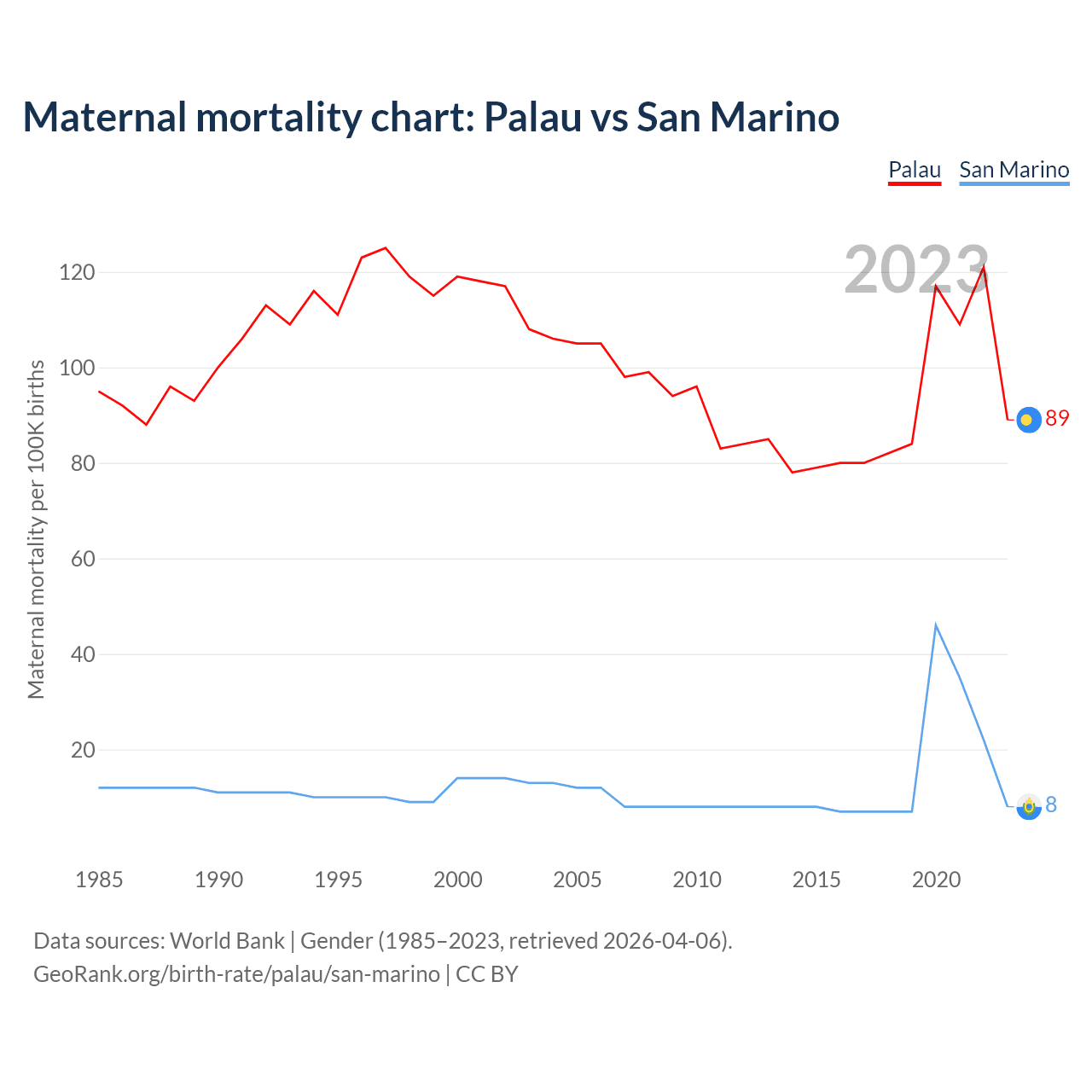 The maternal mortality rate, which is the probability of dying during childbirth or within 42 days of pregnancy termination, is 89 deaths per 100,000 live births in Palau, compared to 8 deaths in San Marino.