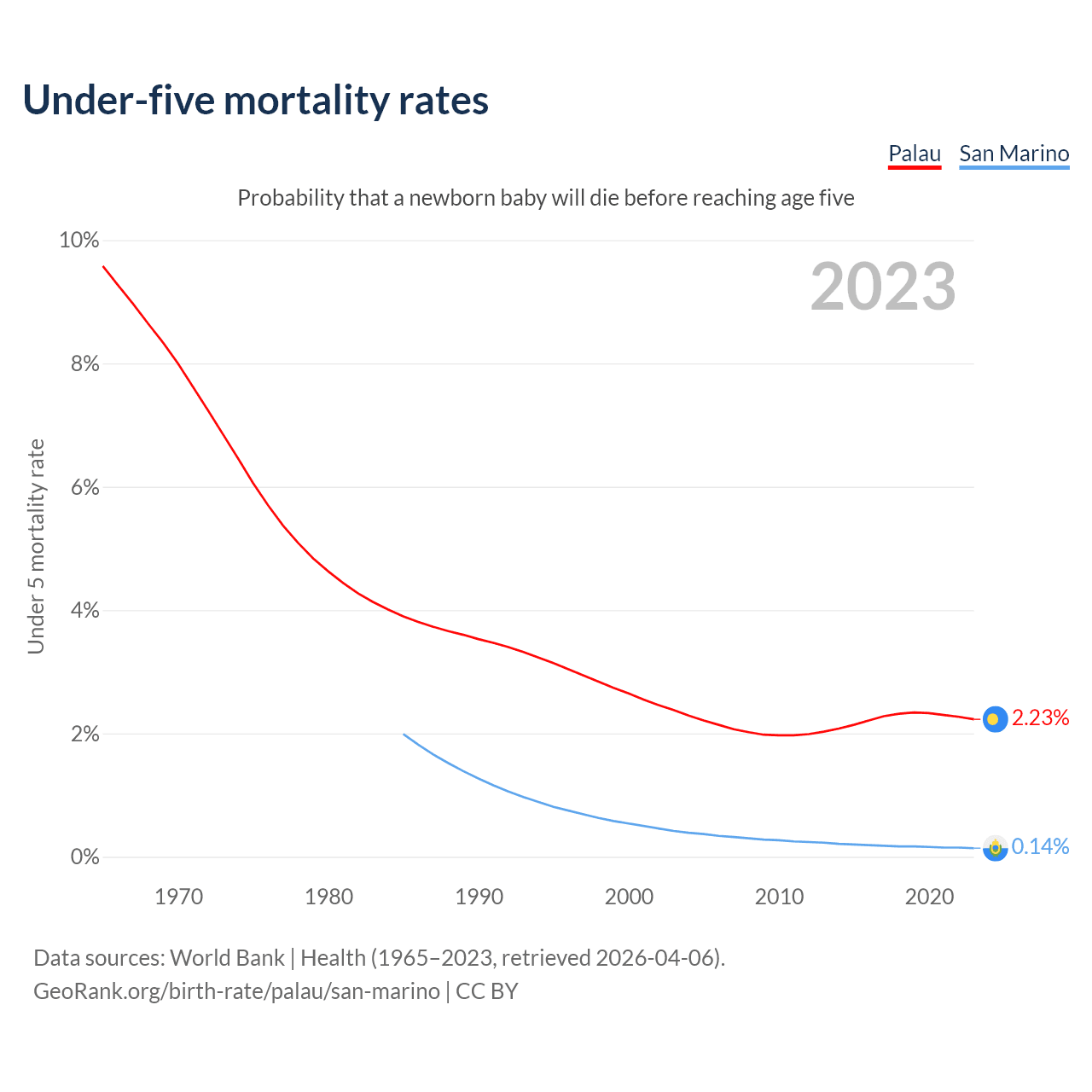 The chance that a newborn baby will die before reaching age five is 2.23% in Palau and 0.14% in San Marino. Above is a chart with historical data on under-five mortality rates.