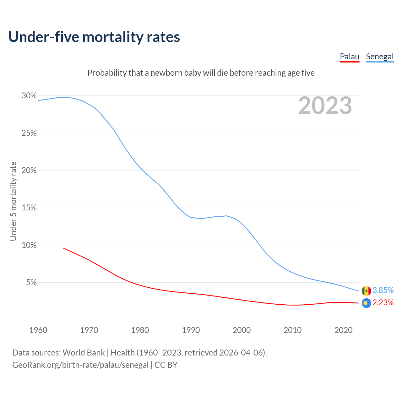 The chance that a newborn baby will die before reaching age five is 2.23% in Palau and 3.85% in Senegal. Above is a chart with historical data on under-five mortality rates.