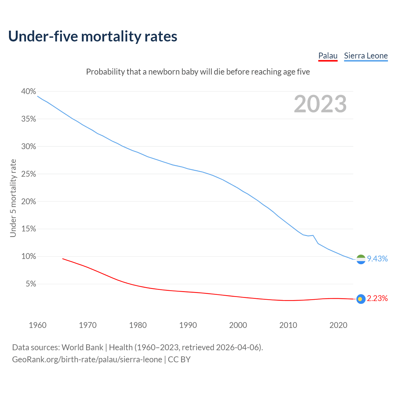 The chance that a newborn baby will die before reaching age five is 2.23% in Palau and 9.43% in Sierra Leone. Above is a chart with historical data on under-five mortality rates.