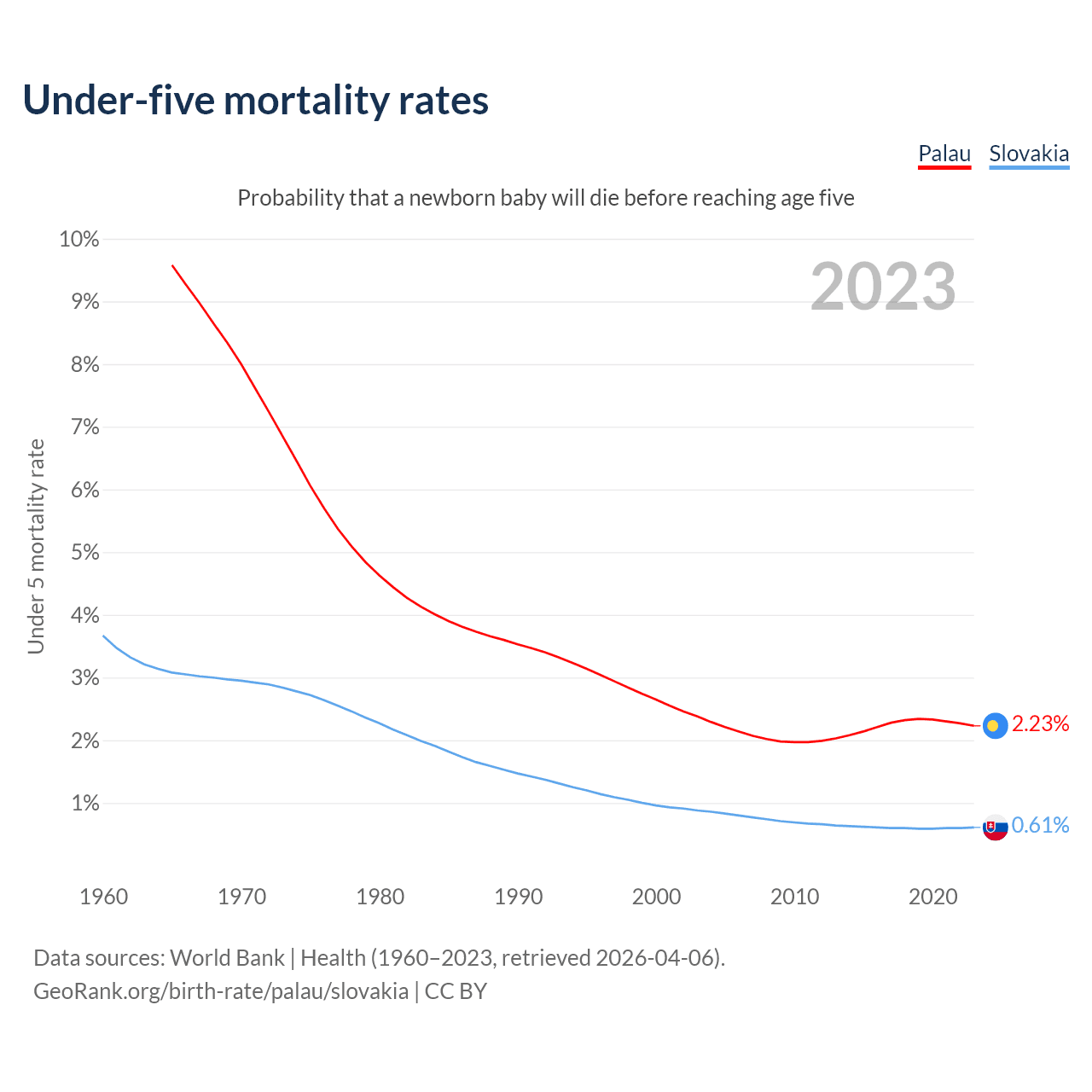 The chance that a newborn baby will die before reaching age five is 2.23% in Palau and 0.61% in Slovakia. Above is a chart with historical data on under-five mortality rates.