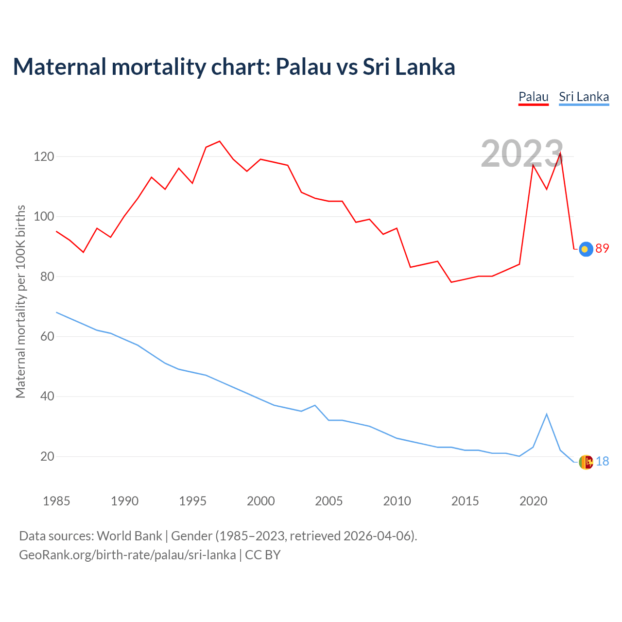 The maternal mortality rate, which is the probability of dying during childbirth or within 42 days of pregnancy termination, is 89 deaths per 100,000 live births in Palau, compared to 18 deaths in Sri Lanka.