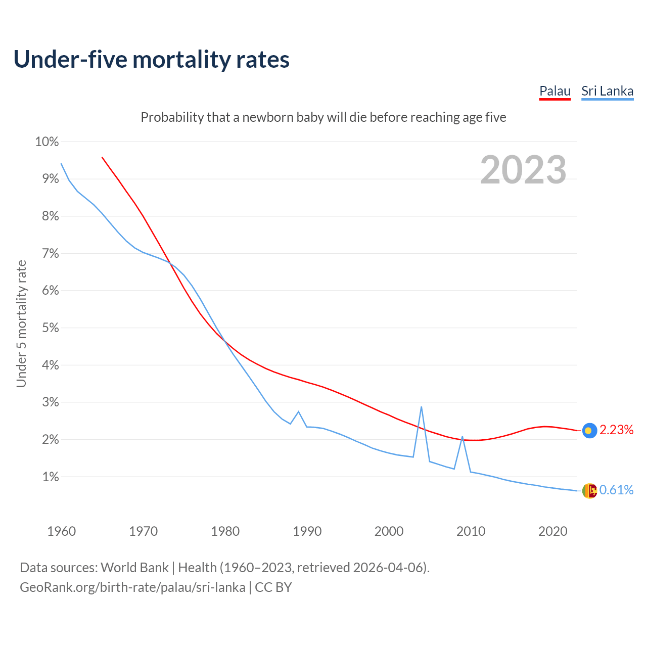The chance that a newborn baby will die before reaching age five is 2.23% in Palau and 0.61% in Sri Lanka. Above is a chart with historical data on under-five mortality rates.