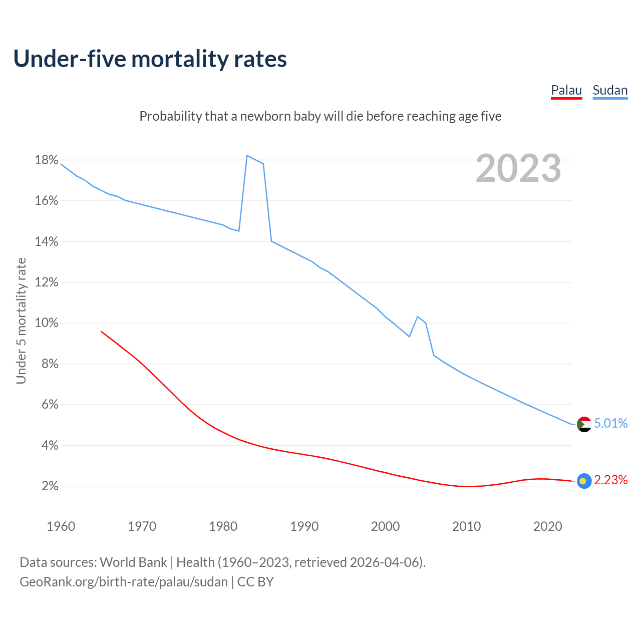 The chance that a newborn baby will die before reaching age five is 2.23% in Palau and 5.01% in Sudan. Above is a chart with historical data on under-five mortality rates.