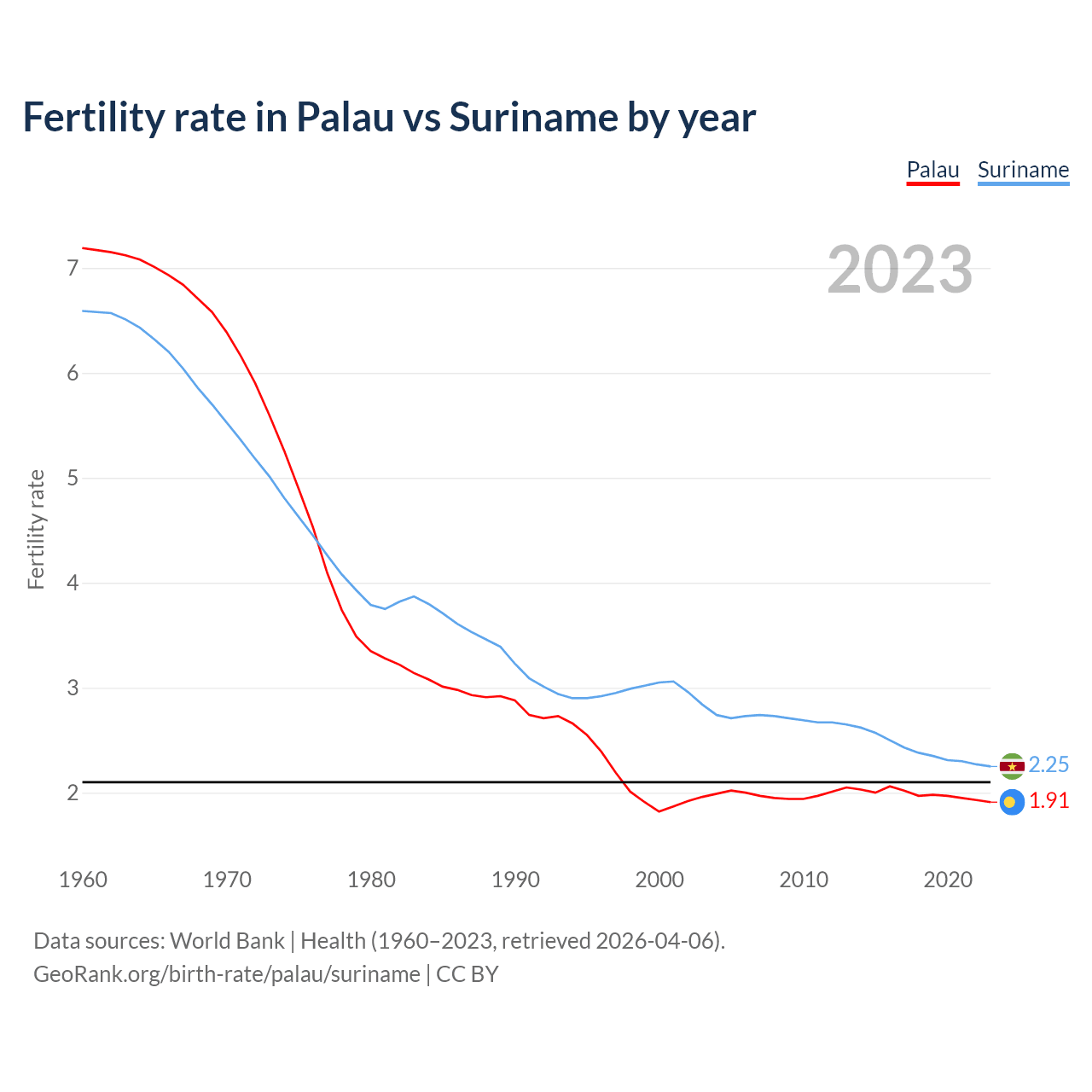 1960 vs 2023, the fertility rate has decreased by 73.5% in Palau and by 65.9% in Suriname — in 1960, it was 7.19 and 6.59, respectively.