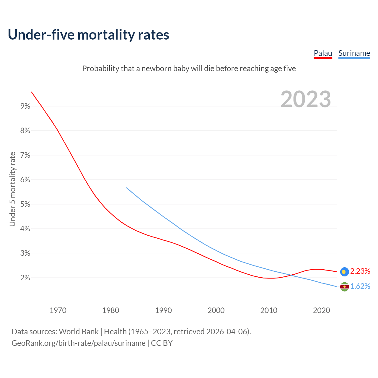 The chance that a newborn baby will die before reaching age five is 2.23% in Palau and 1.62% in Suriname. Above is a chart with historical data on under-five mortality rates.
