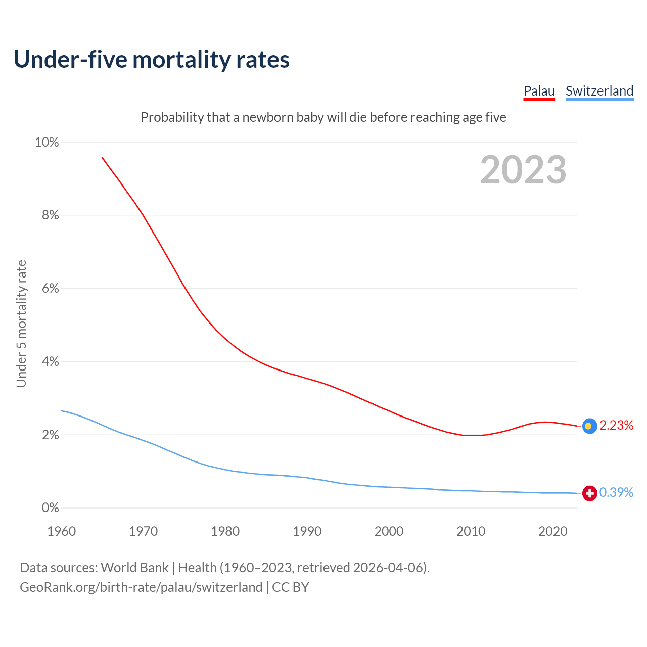 The chance that a newborn baby will die before reaching age five is 2.23% in Palau and 0.39% in Switzerland. Above is a chart with historical data on under-five mortality rates.