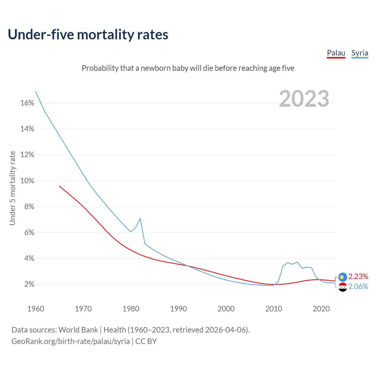 The chance that a newborn baby will die before reaching age five is 2.23% in Palau and 2.06% in Syria. Above is a chart with historical data on under-five mortality rates.