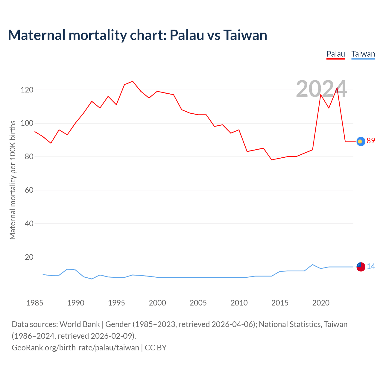 The maternal mortality rate, which is the probability of dying during childbirth or within 42 days of pregnancy termination, is 89 deaths per 100,000 live births in Palau, compared to 14 deaths in Taiwan.