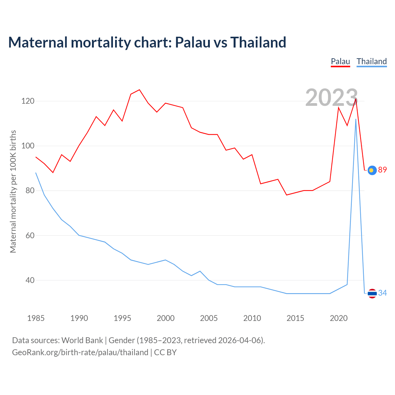 The maternal mortality rate, which is the probability of dying during childbirth or within 42 days of pregnancy termination, is 89 deaths per 100,000 live births in Palau, compared to 34 deaths in Thailand.