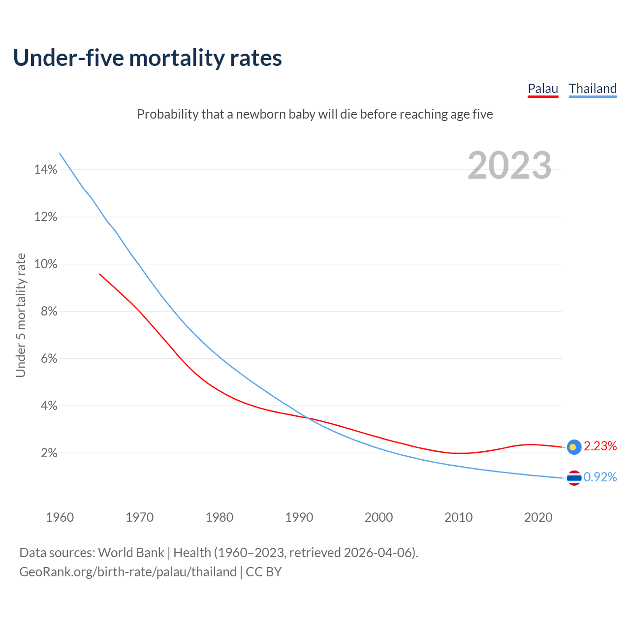 The chance that a newborn baby will die before reaching age five is 2.23% in Palau and 0.92% in Thailand. Above is a chart with historical data on under-five mortality rates.