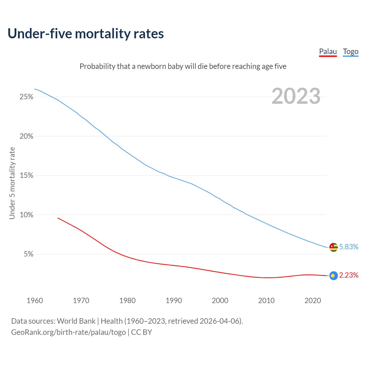 The chance that a newborn baby will die before reaching age five is 2.23% in Palau and 5.83% in Togo. Above is a chart with historical data on under-five mortality rates.