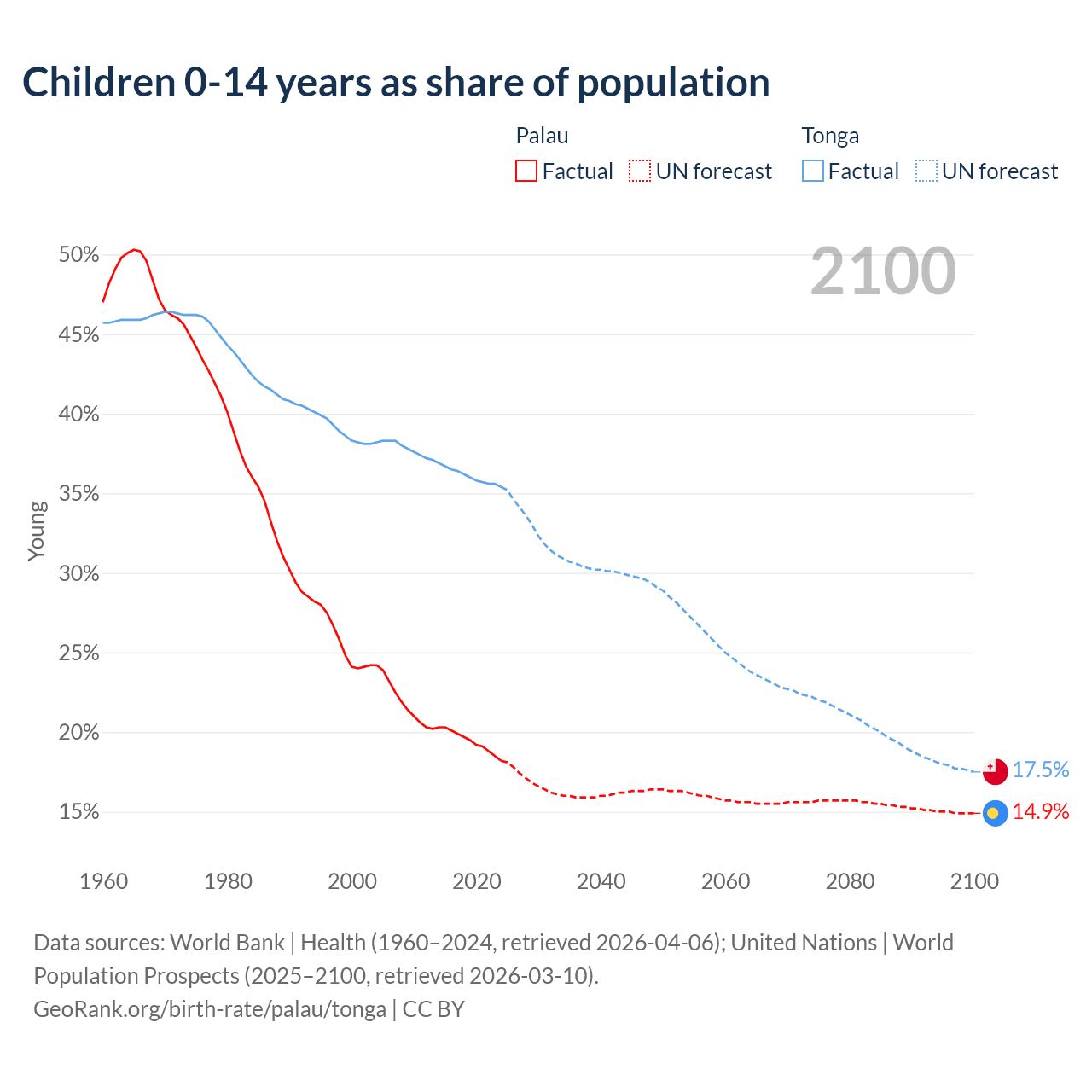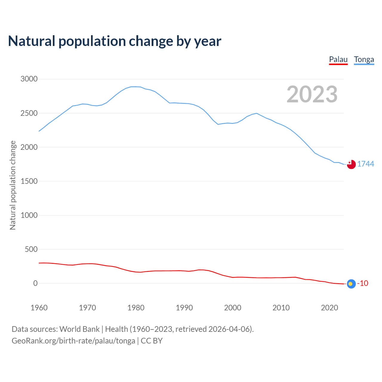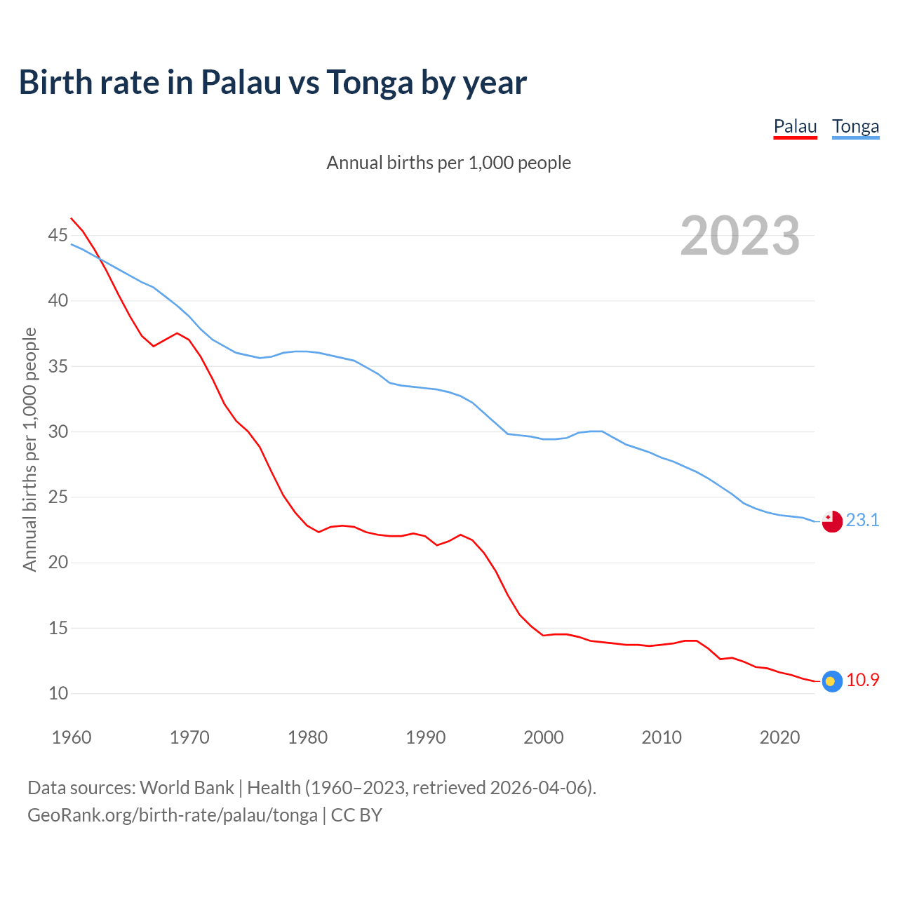 According to the latest available data on birth rates, the fertility rate in Palau was 1.91 children per woman in 2023, compared to 3.13 in Tonga in 2023. The replacement level is considered to be 2.1 children per woman.