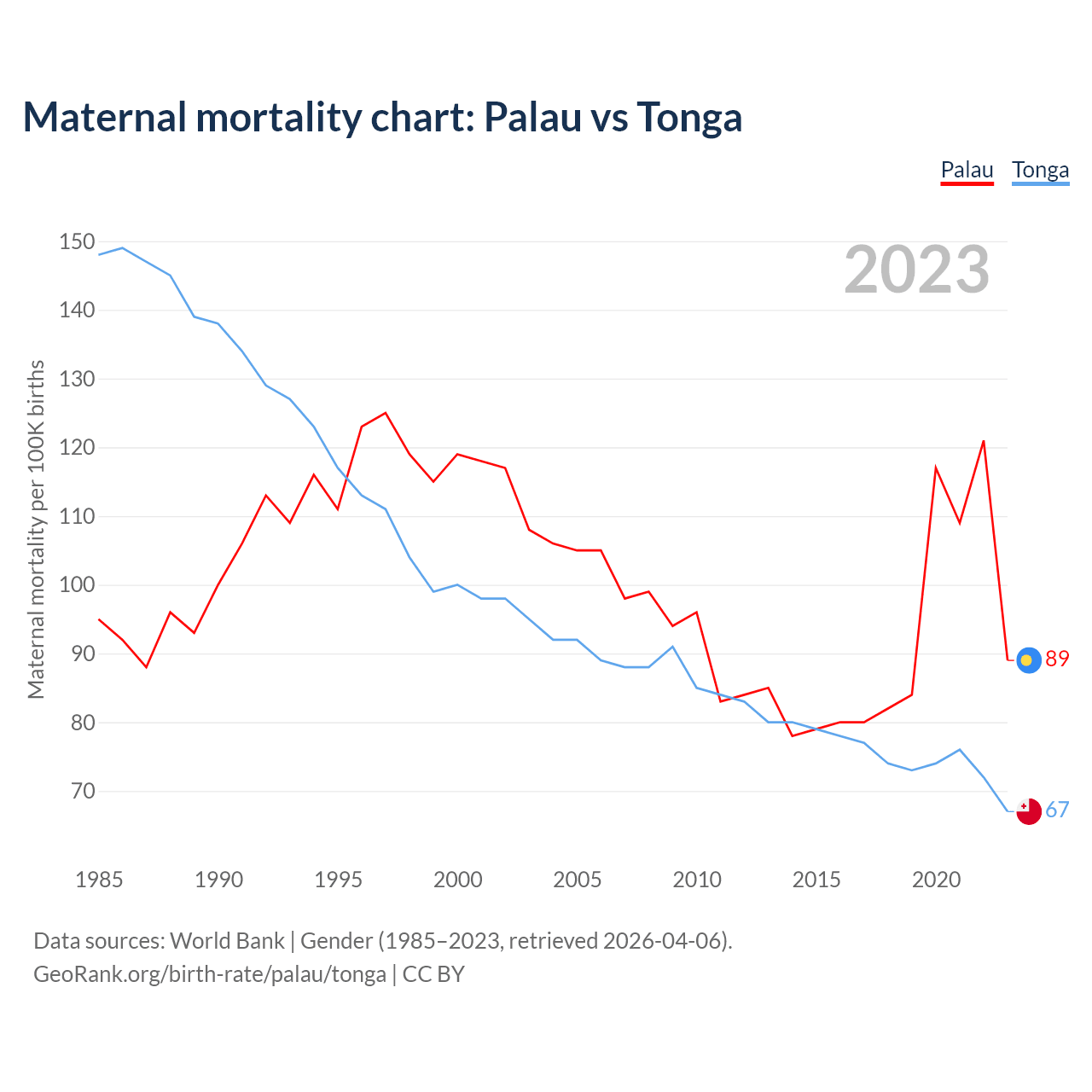 The maternal mortality rate, which is the probability of dying during childbirth or within 42 days of pregnancy termination, is 89 deaths per 100,000 live births in Palau, compared to 67 deaths in Tonga.