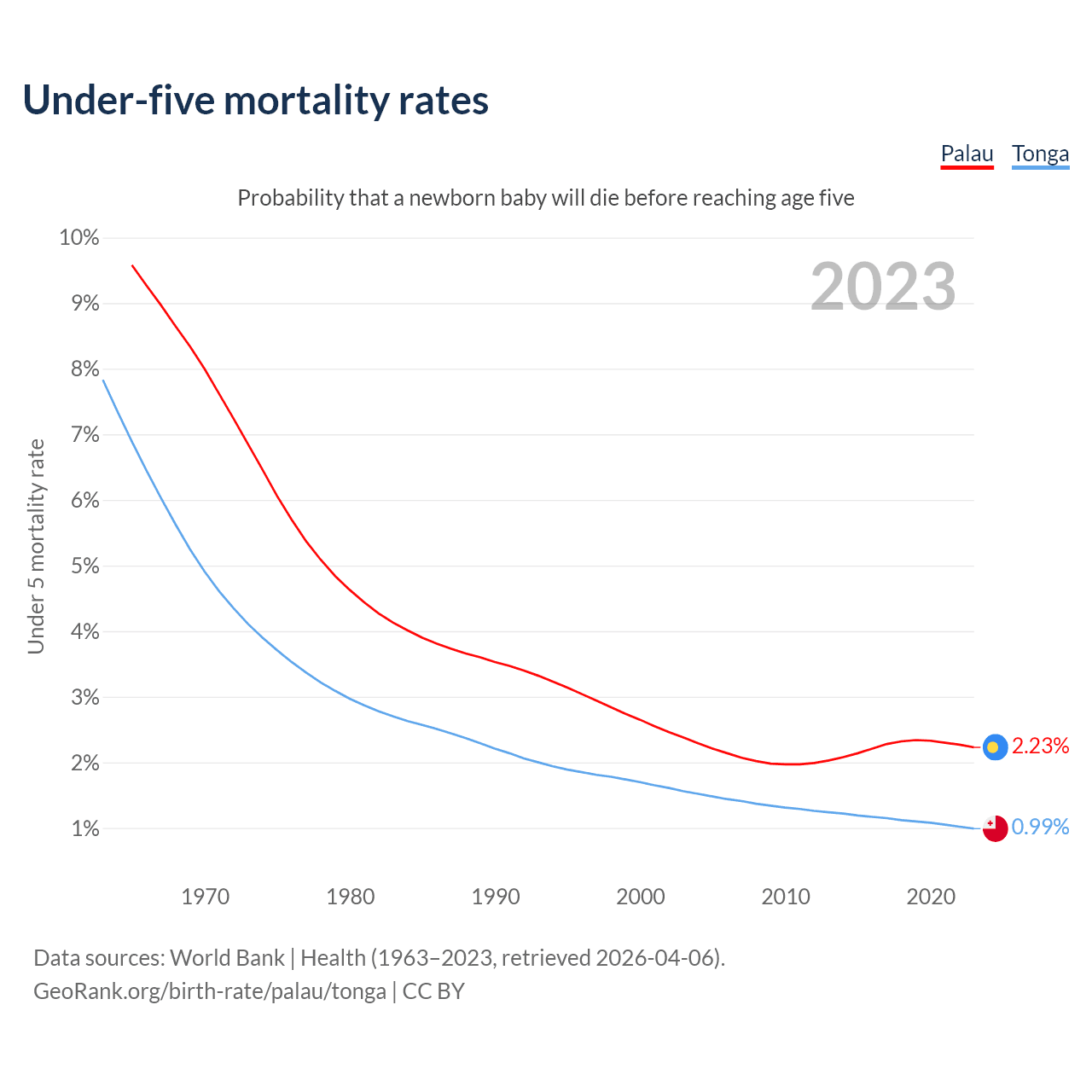 The chance that a newborn baby will die before reaching age five is 2.23% in Palau and 0.99% in Tonga. Above is a chart with historical data on under-five mortality rates.