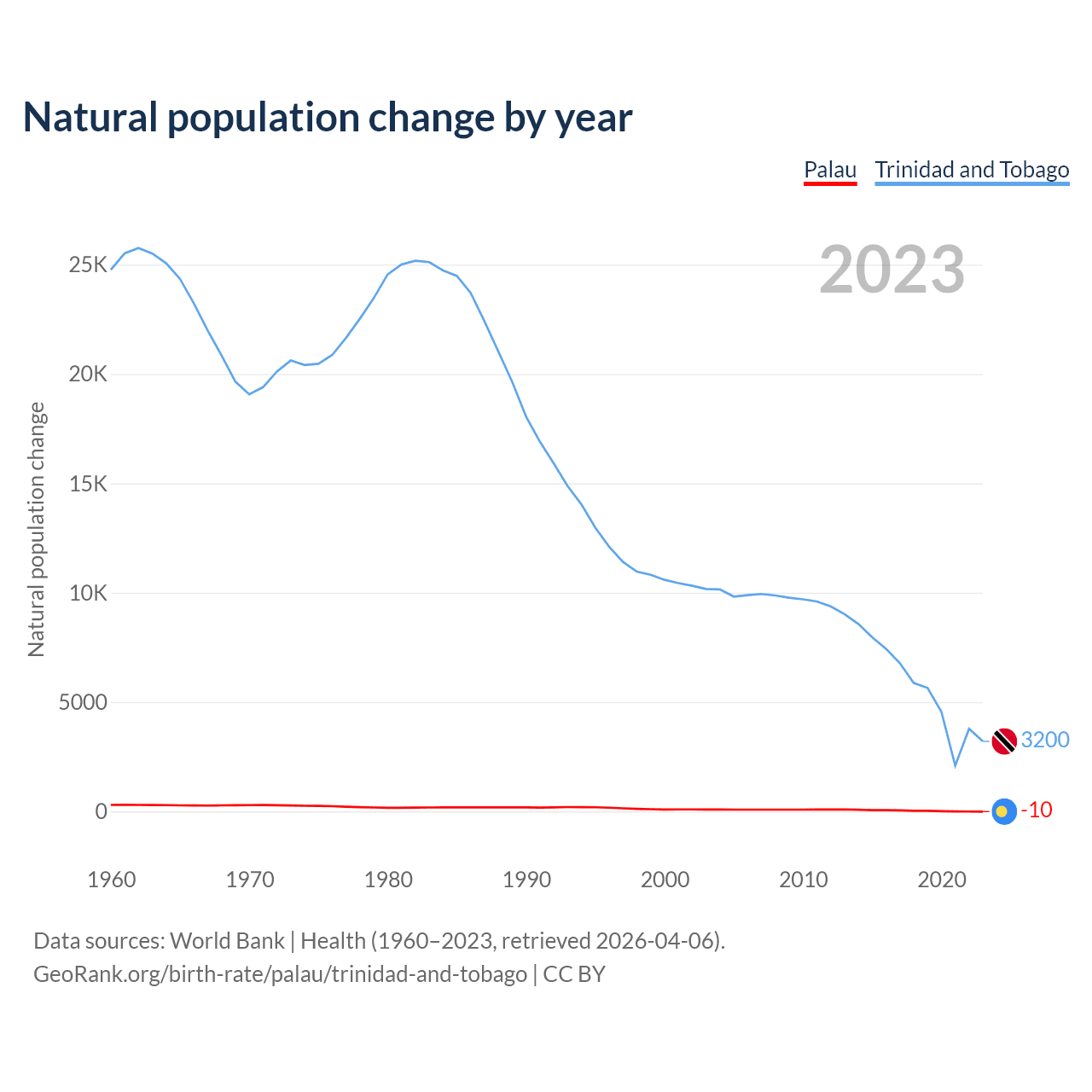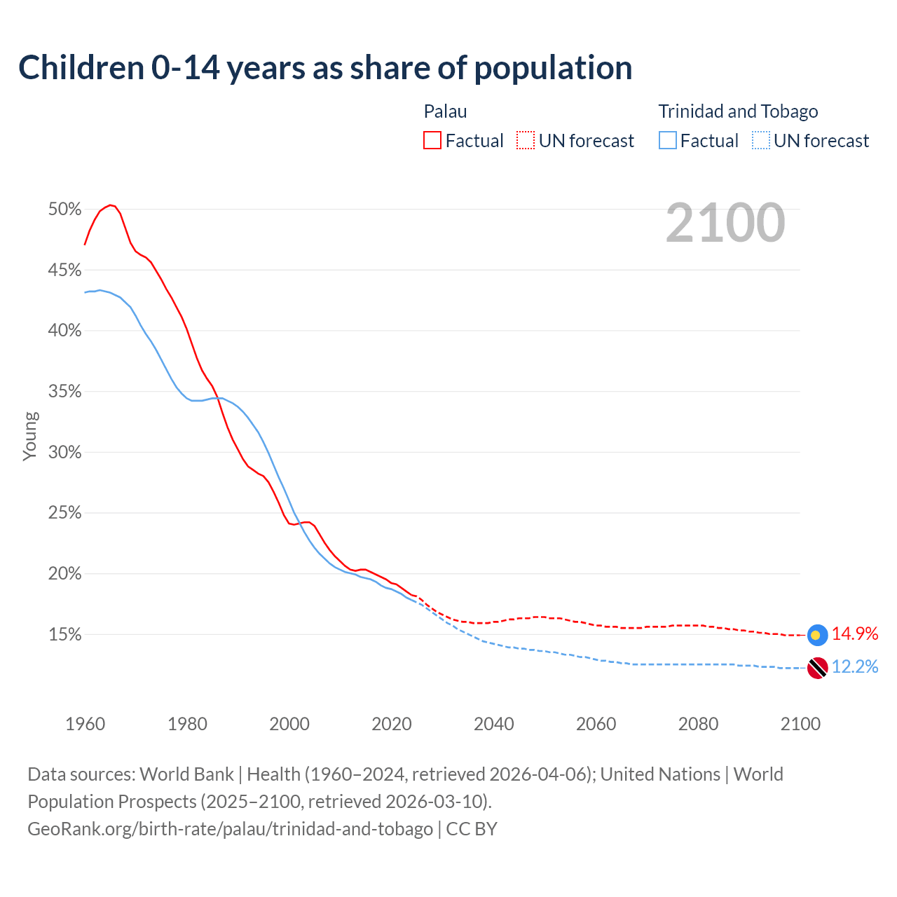 According to the latest available data on birth rates, the fertility rate in Palau was 1.91 children per woman in 2023, compared to 1.53 in Trinidad and Tobago in 2023. The replacement level is considered to be 2.1 children per woman.