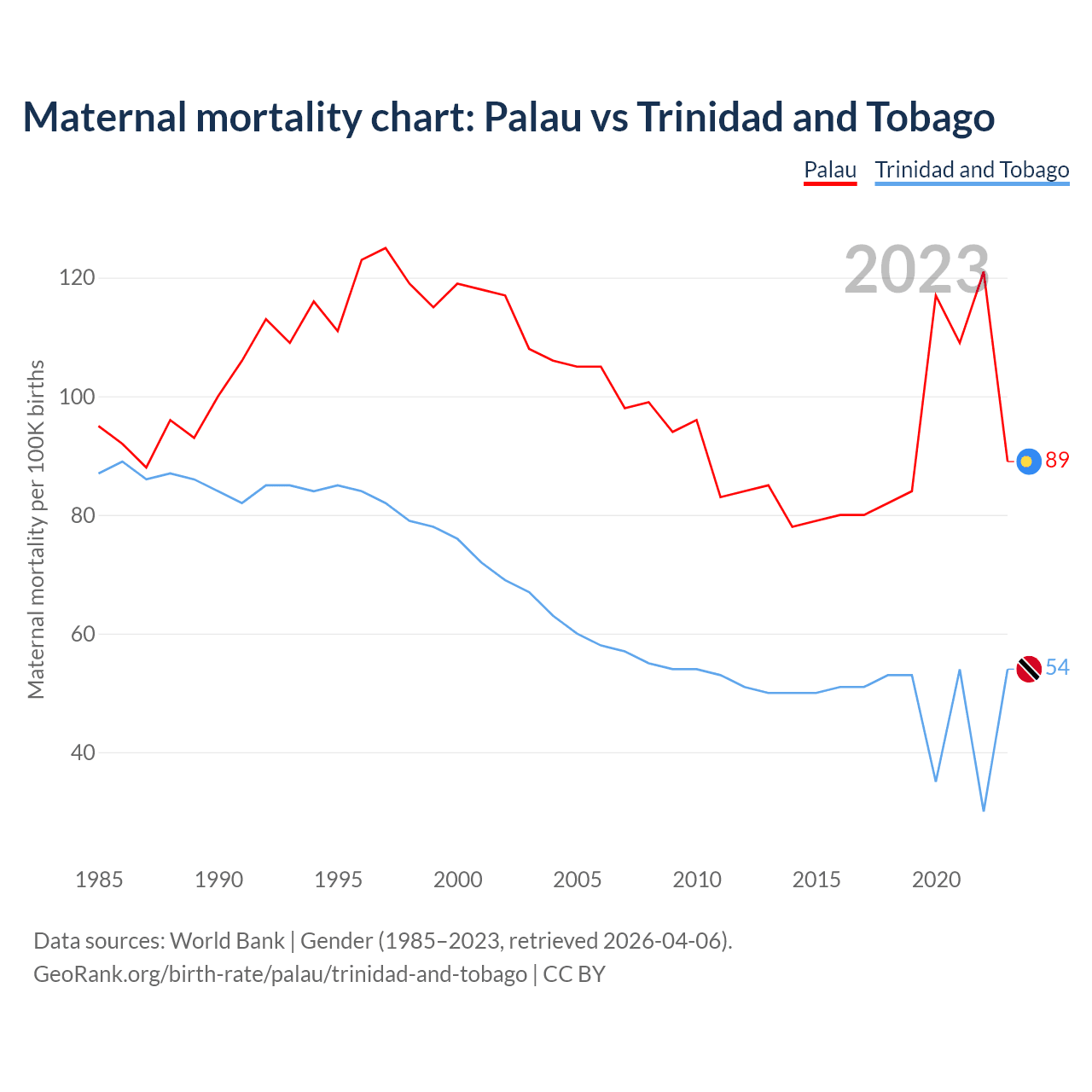 The maternal mortality rate, which is the probability of dying during childbirth or within 42 days of pregnancy termination, is 89 deaths per 100,000 live births in Palau, compared to 54 deaths in Trinidad and Tobago.