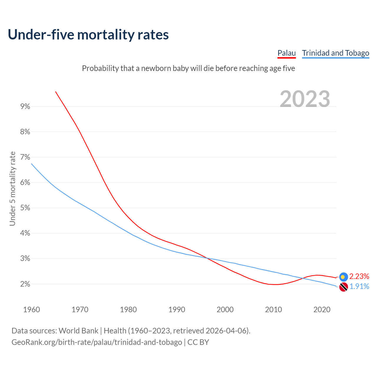 The chance that a newborn baby will die before reaching age five is 2.23% in Palau and 1.91% in Trinidad and Tobago. Above is a chart with historical data on under-five mortality rates.