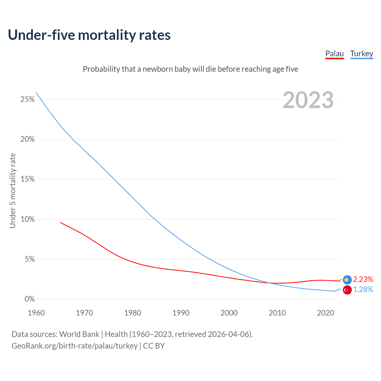 The chance that a newborn baby will die before reaching age five is 2.23% in Palau and 1.28% in Turkey. Above is a chart with historical data on under-five mortality rates.