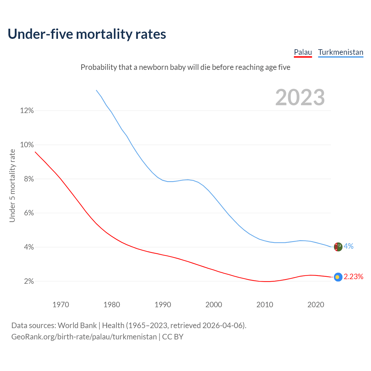 The chance that a newborn baby will die before reaching age five is 2.23% in Palau and 4% in Turkmenistan. Above is a chart with historical data on under-five mortality rates.