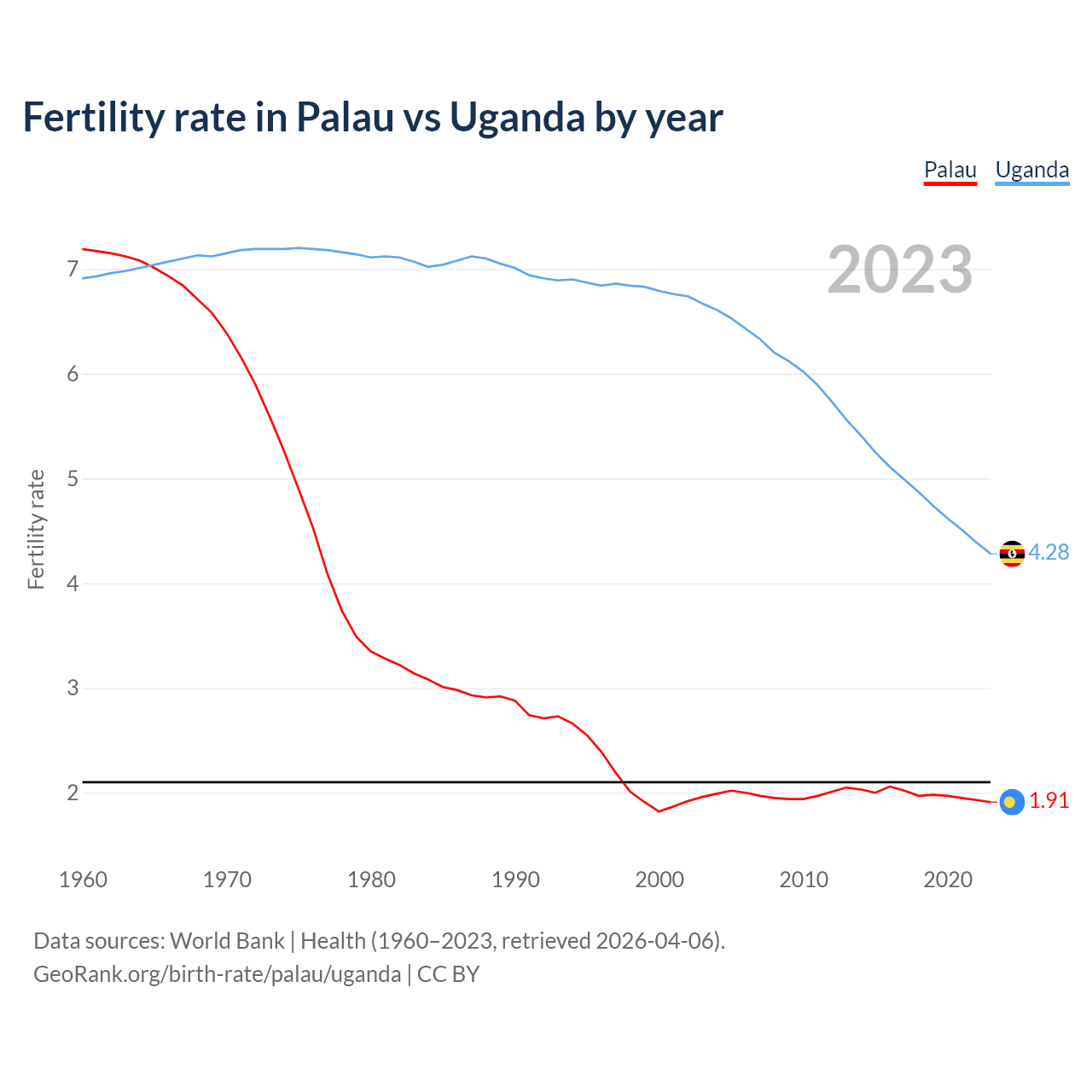 According to the latest available data on birth rates, the fertility rate in Palau was 1.91 children per woman in 2023, compared to 4.28 in Uganda in 2023. The replacement level is considered to be 2.1 children per woman.