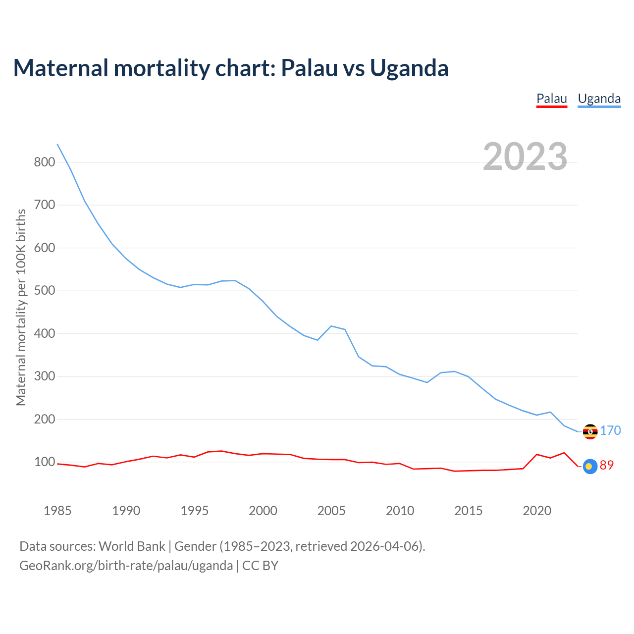 The maternal mortality rate, which is the probability of dying during childbirth or within 42 days of pregnancy termination, is 89 deaths per 100,000 live births in Palau, compared to 170 deaths in Uganda.