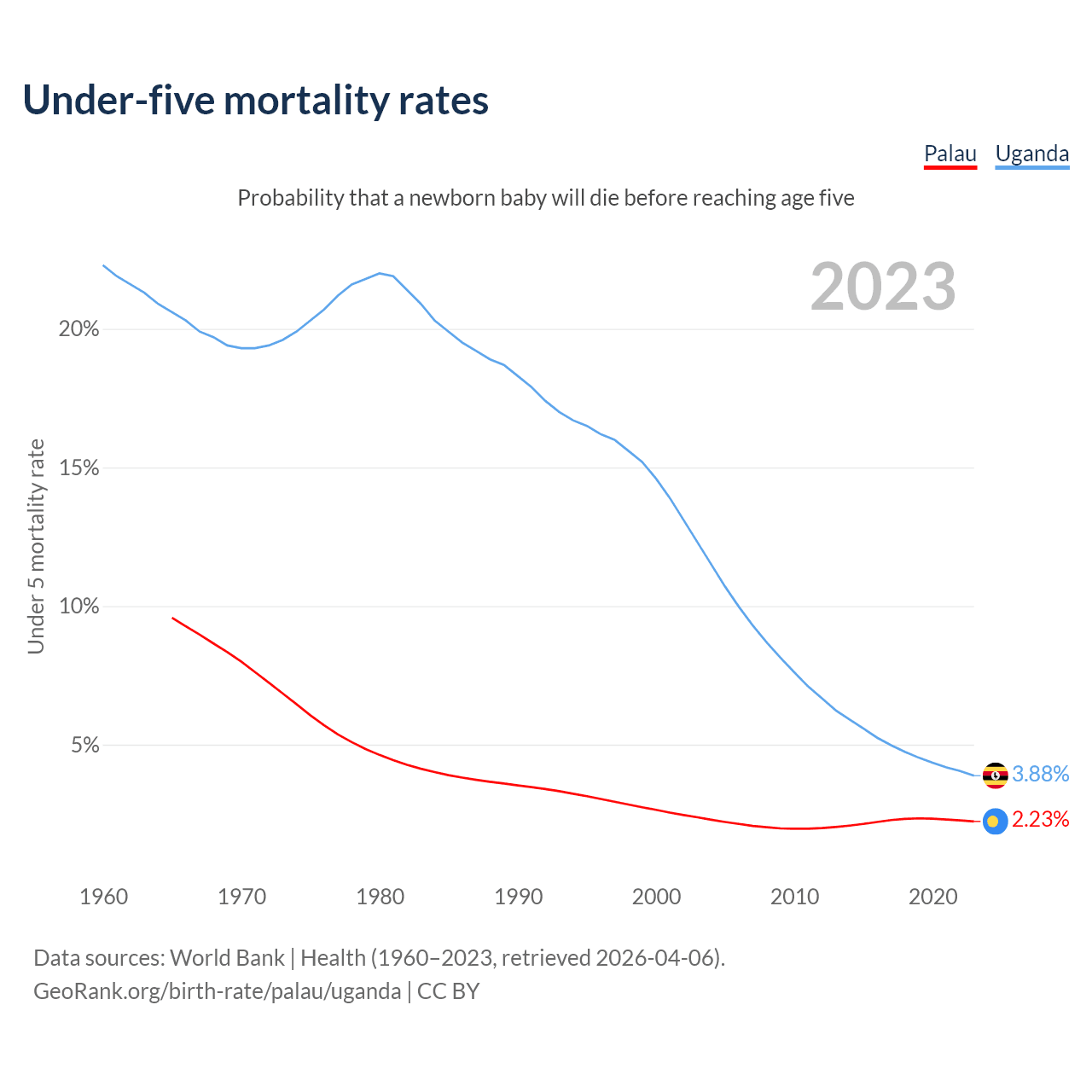 The chance that a newborn baby will die before reaching age five is 2.23% in Palau and 3.88% in Uganda. Above is a chart with historical data on under-five mortality rates.