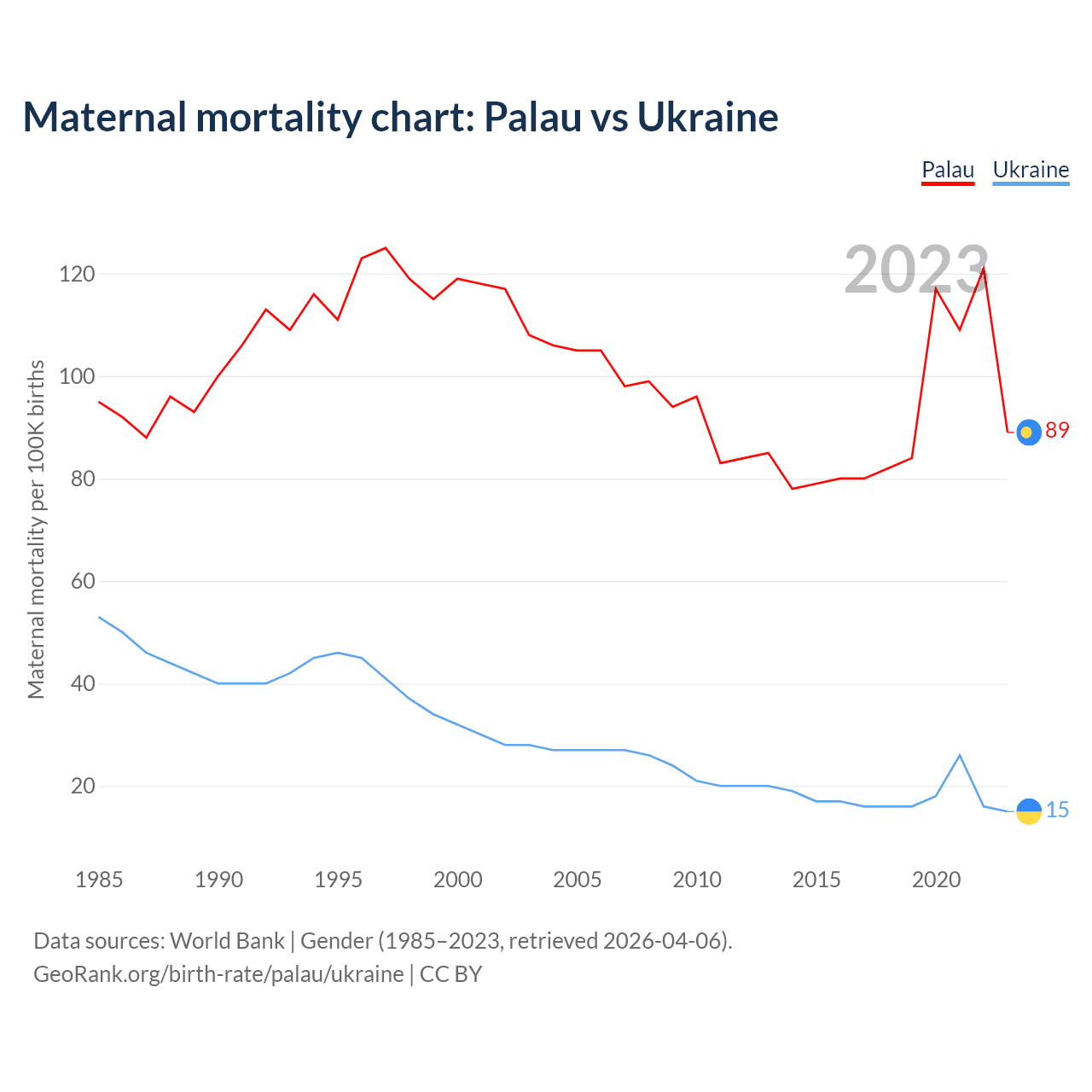 The maternal mortality rate, which is the probability of dying during childbirth or within 42 days of pregnancy termination, is 89 deaths per 100,000 live births in Palau, compared to 15 deaths in Ukraine.