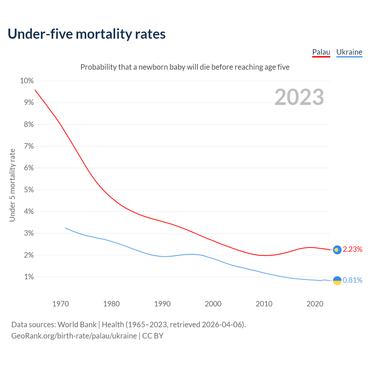 The chance that a newborn baby will die before reaching age five is 2.23% in Palau and 0.81% in Ukraine. Above is a chart with historical data on under-five mortality rates.