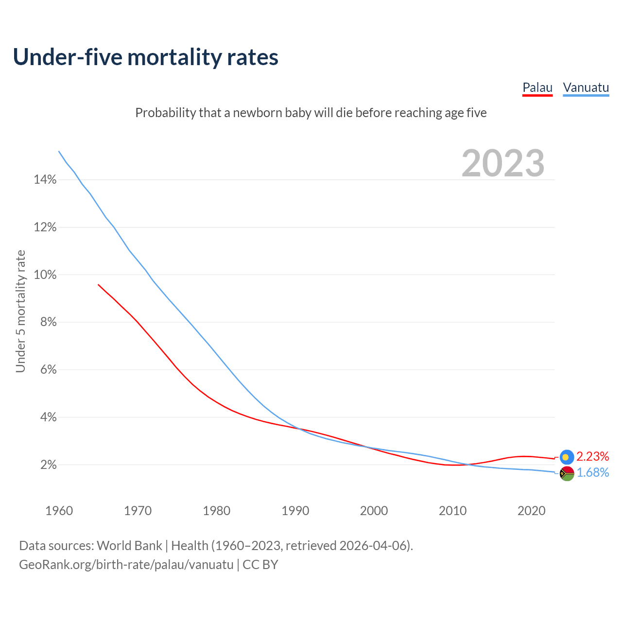 The chance that a newborn baby will die before reaching age five is 2.23% in Palau and 1.68% in Vanuatu. Above is a chart with historical data on under-five mortality rates.