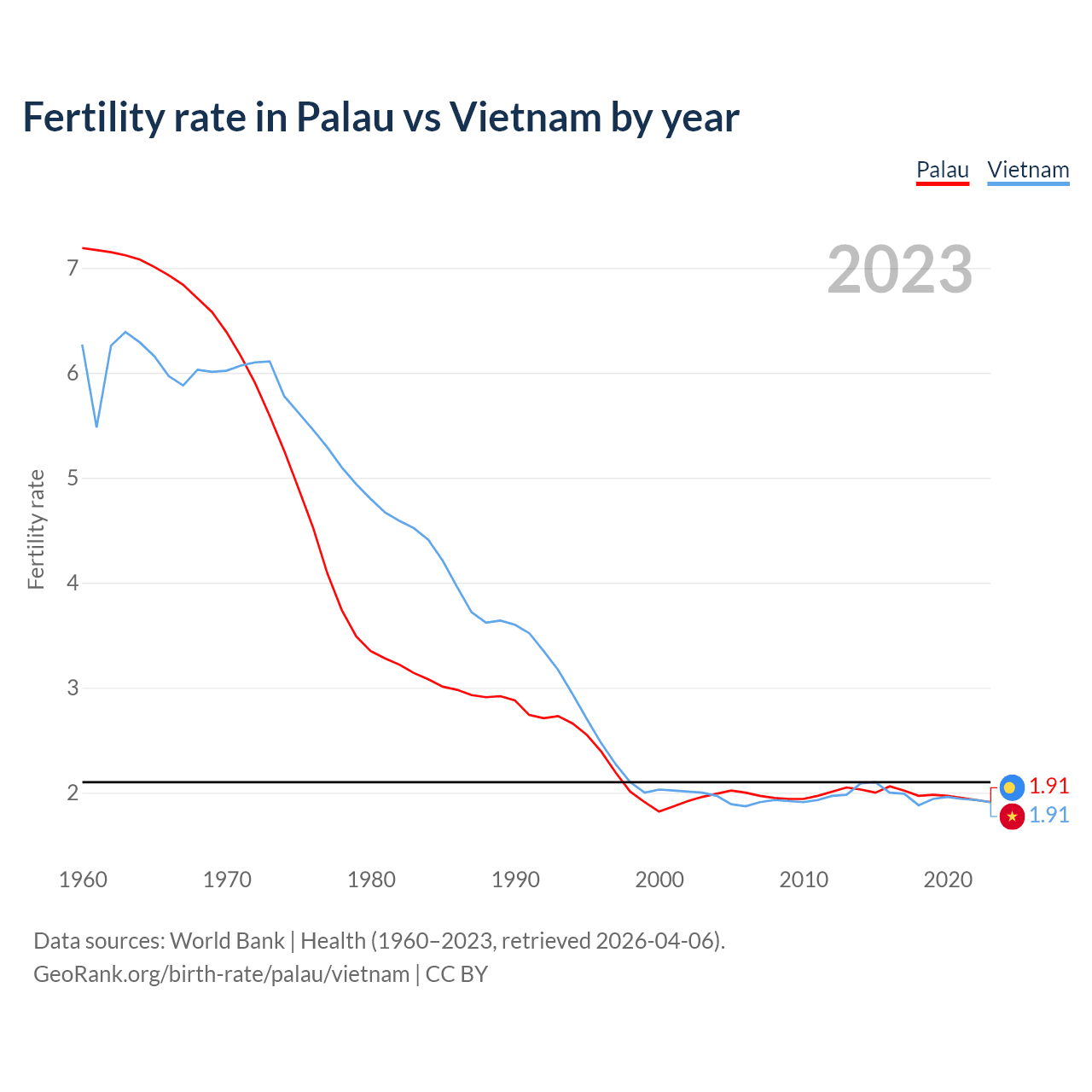 According to the latest available data on birth rates, the fertility rate in Palau was 1.91 children per woman in 2023, compared to 1.91 in Vietnam in 2023. The replacement level is considered to be 2.1 children per woman.